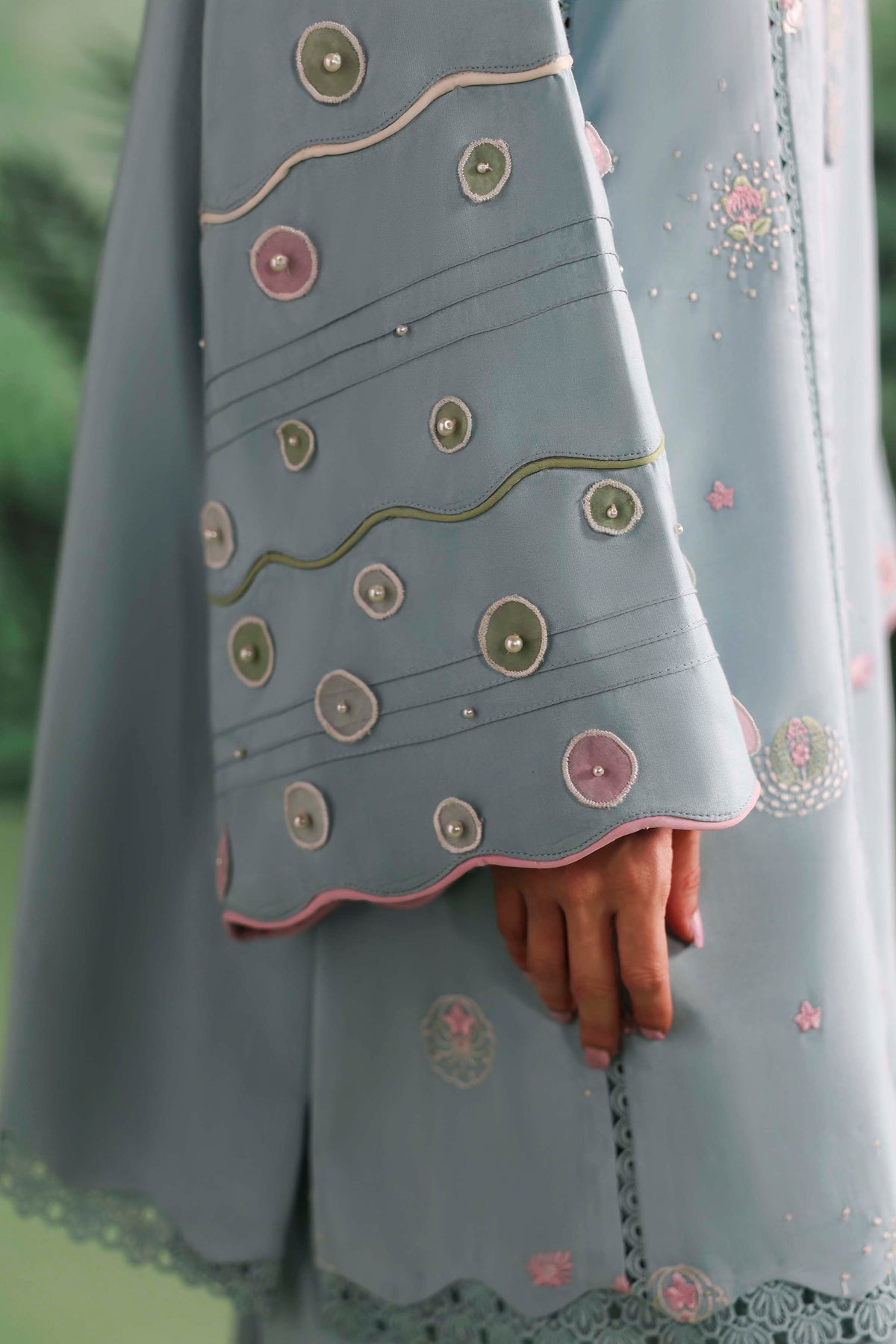 A charming baby blue heavy silk ensemble featuring elegant embroidery on the shalwar, shirt, and dupatta. Its soft hue and refined detailing make it perfect for a variety of occasions. A timelessly beautiful 3-piece suit. (Imported fabric)