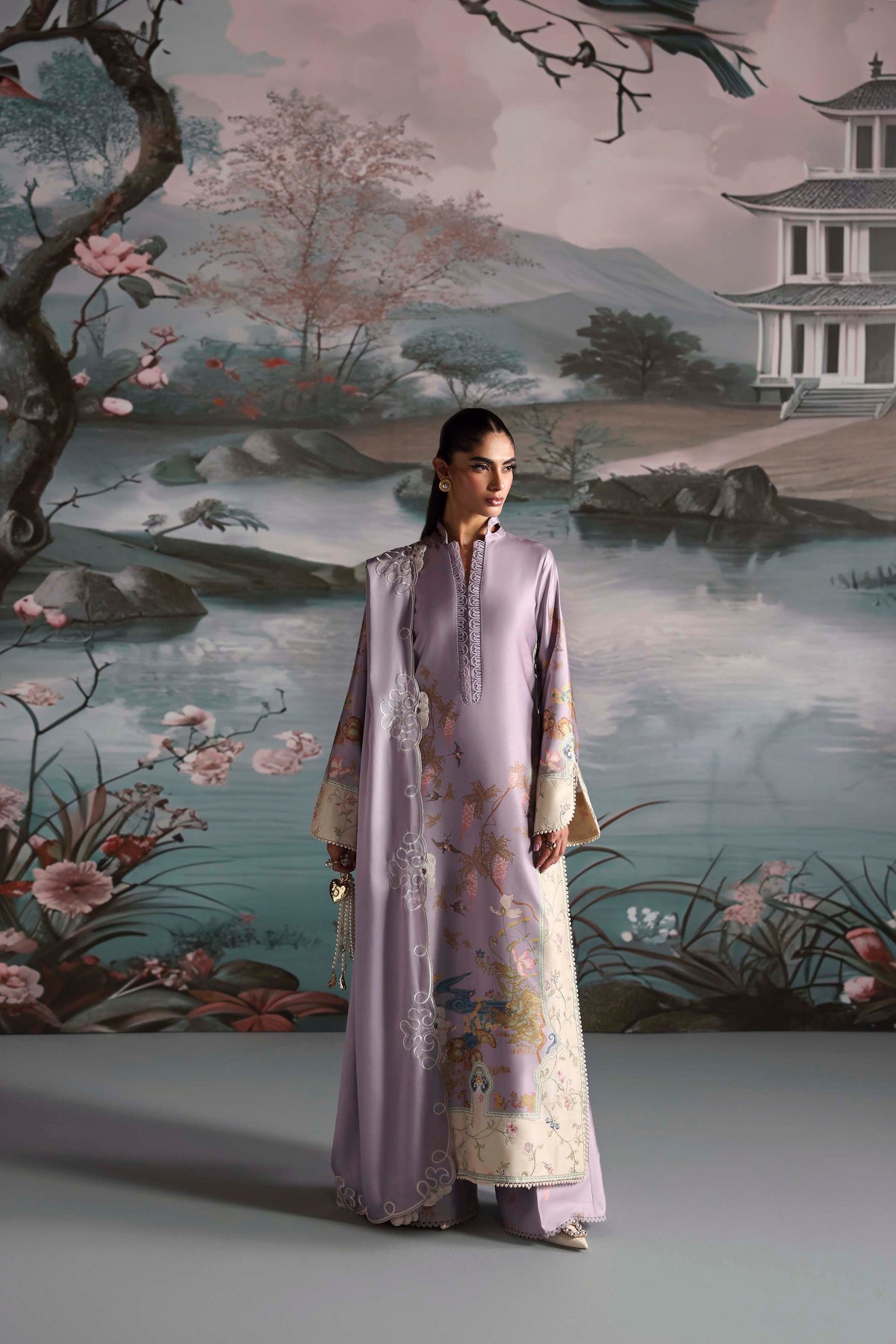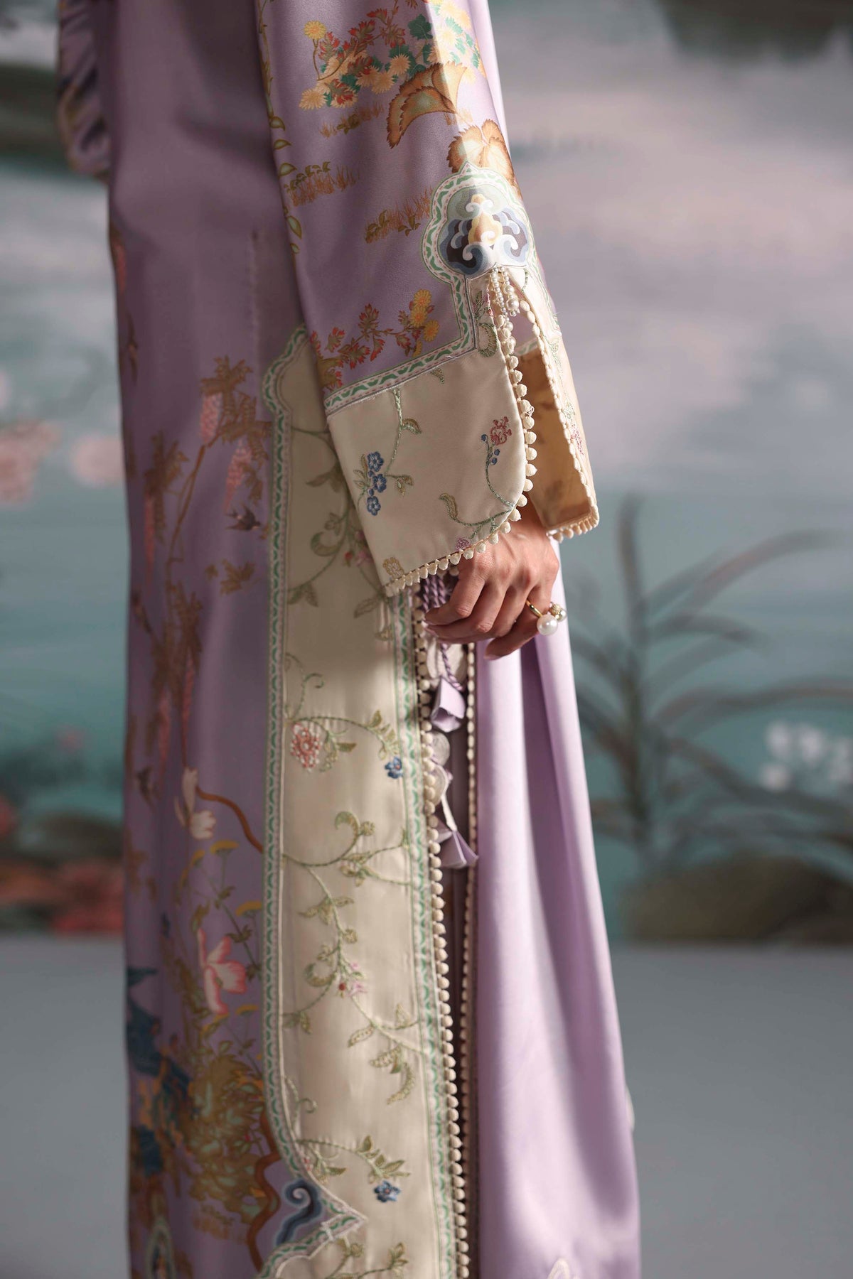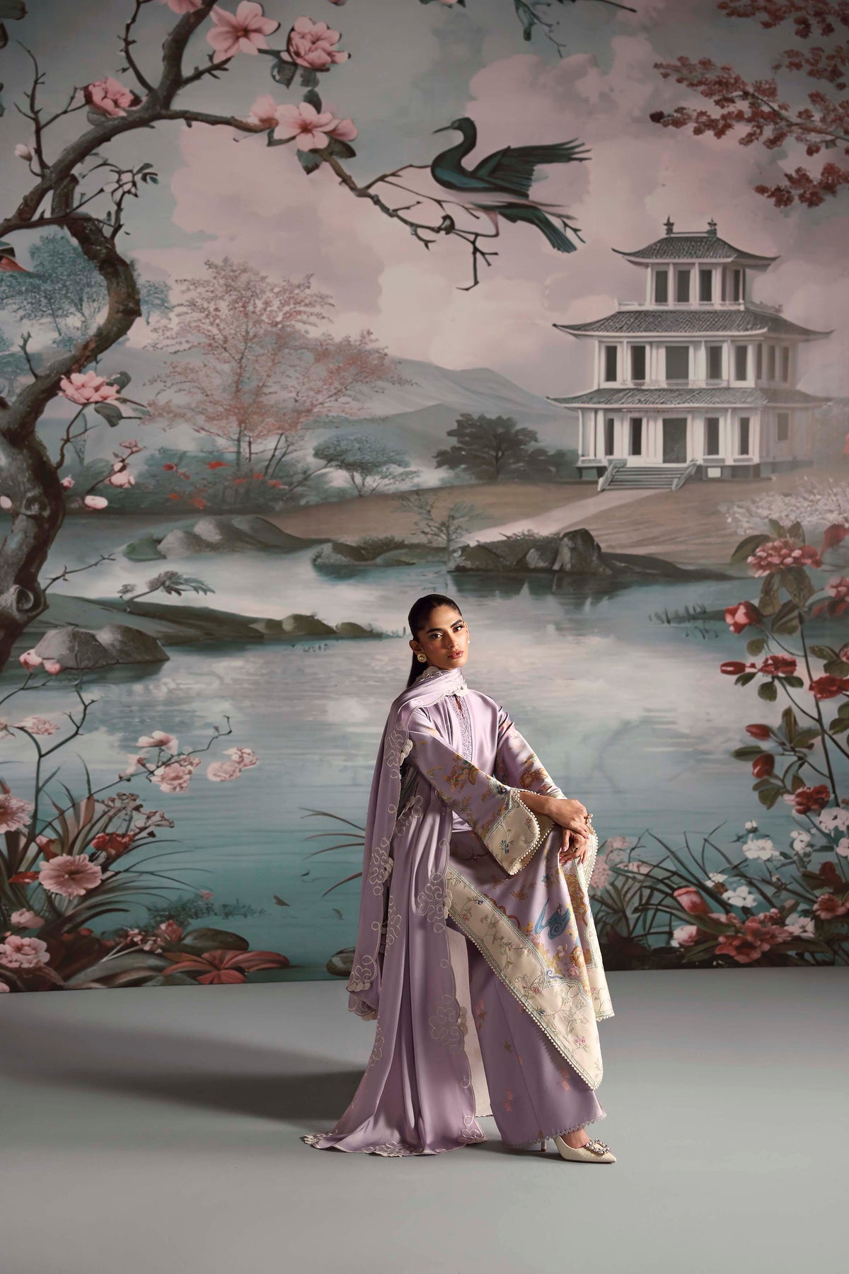 A graceful lavender rod silk outfit adorned with an elegant Ikebana-inspired painting print. The off-white side panels feature delicate embroidery, adding refined charm. Paired with an intricately embroidered dupatta for a complete sophisticated look. (Imported fabric)