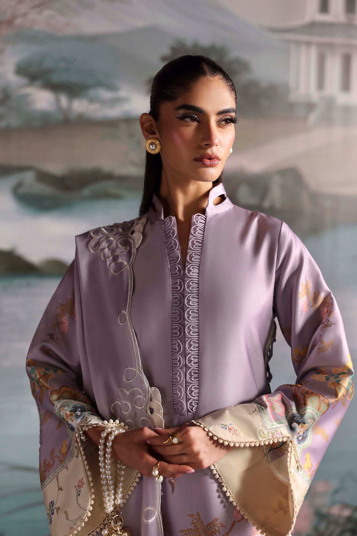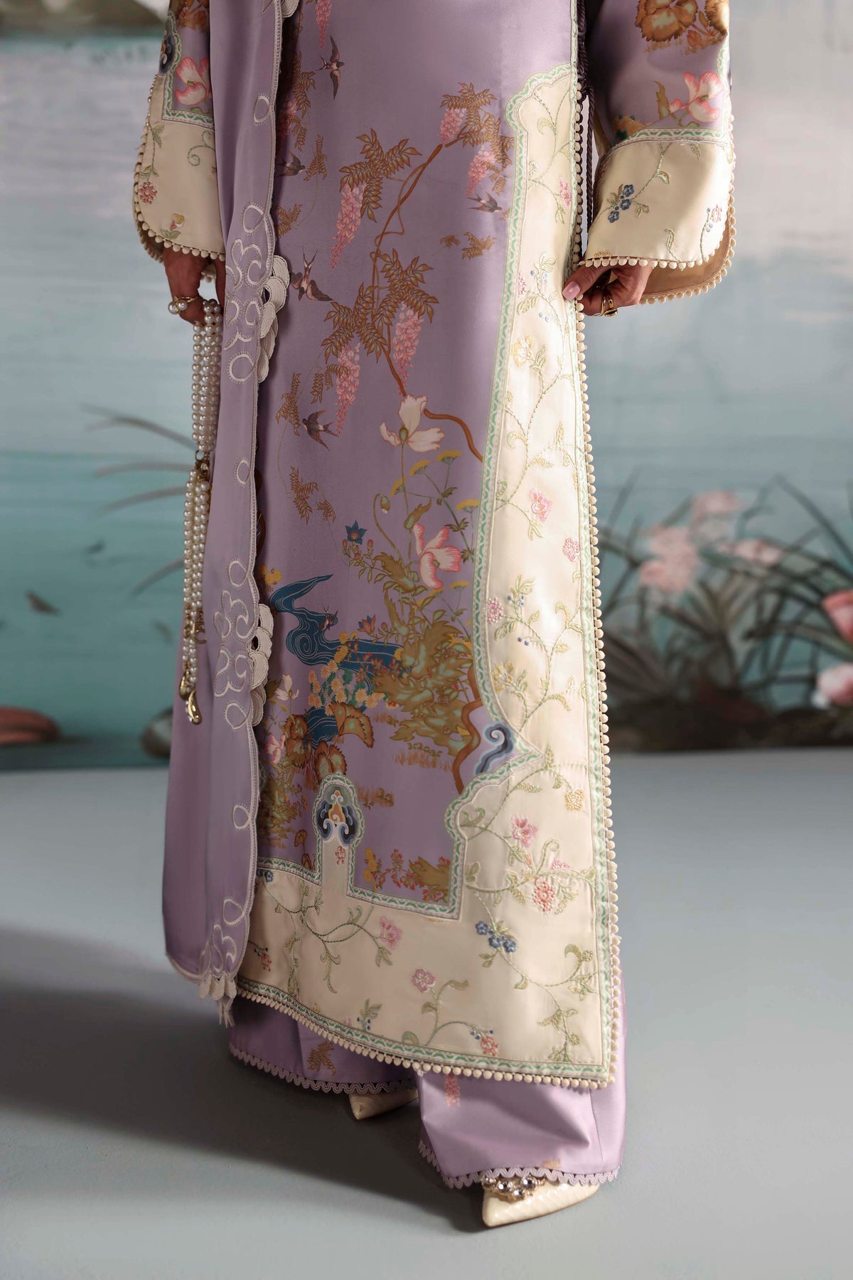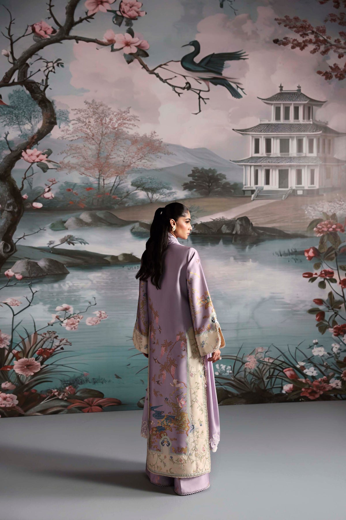 A graceful lavender rod silk outfit adorned with an elegant Ikebana-inspired painting print. The off-white side panels feature delicate embroidery, adding refined charm. Paired with an intricately embroidered dupatta for a complete sophisticated look. (Imported fabric)