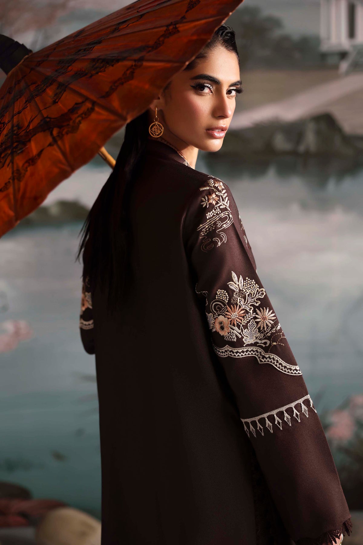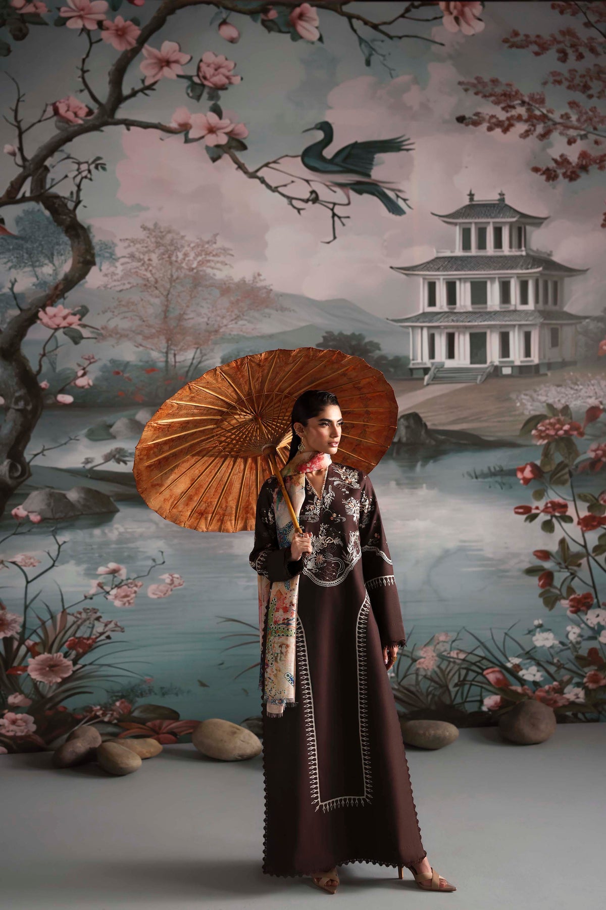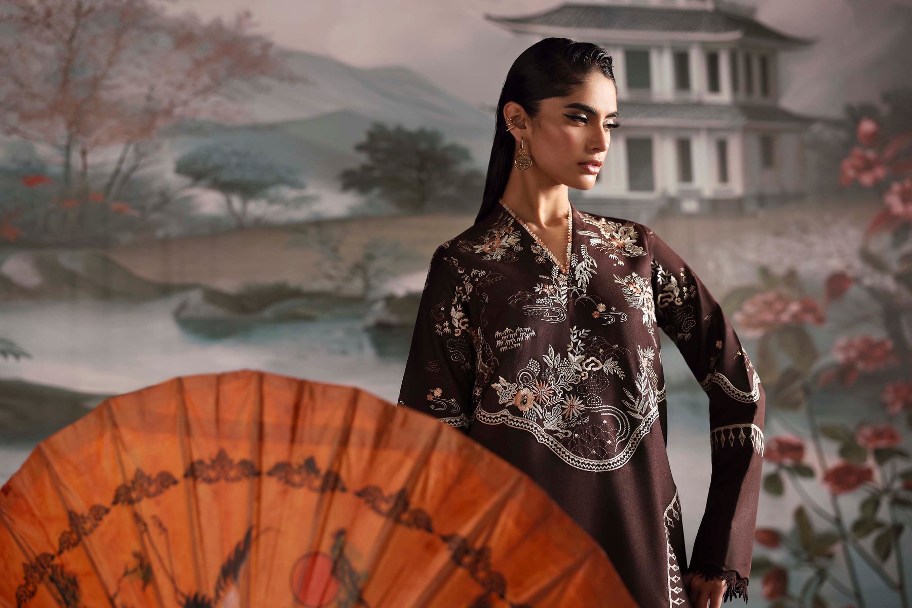 A rich chocolate brown ensemble crafted from thick winter silk fabric, exuding warmth and sophistication. Paired with an imported 100% silk-wool shawl featuring traditional Nikko Shishi Japanese embroidery. A beautifully designed luxury pret 3-piece for timeless elegance. (Imported fabric)