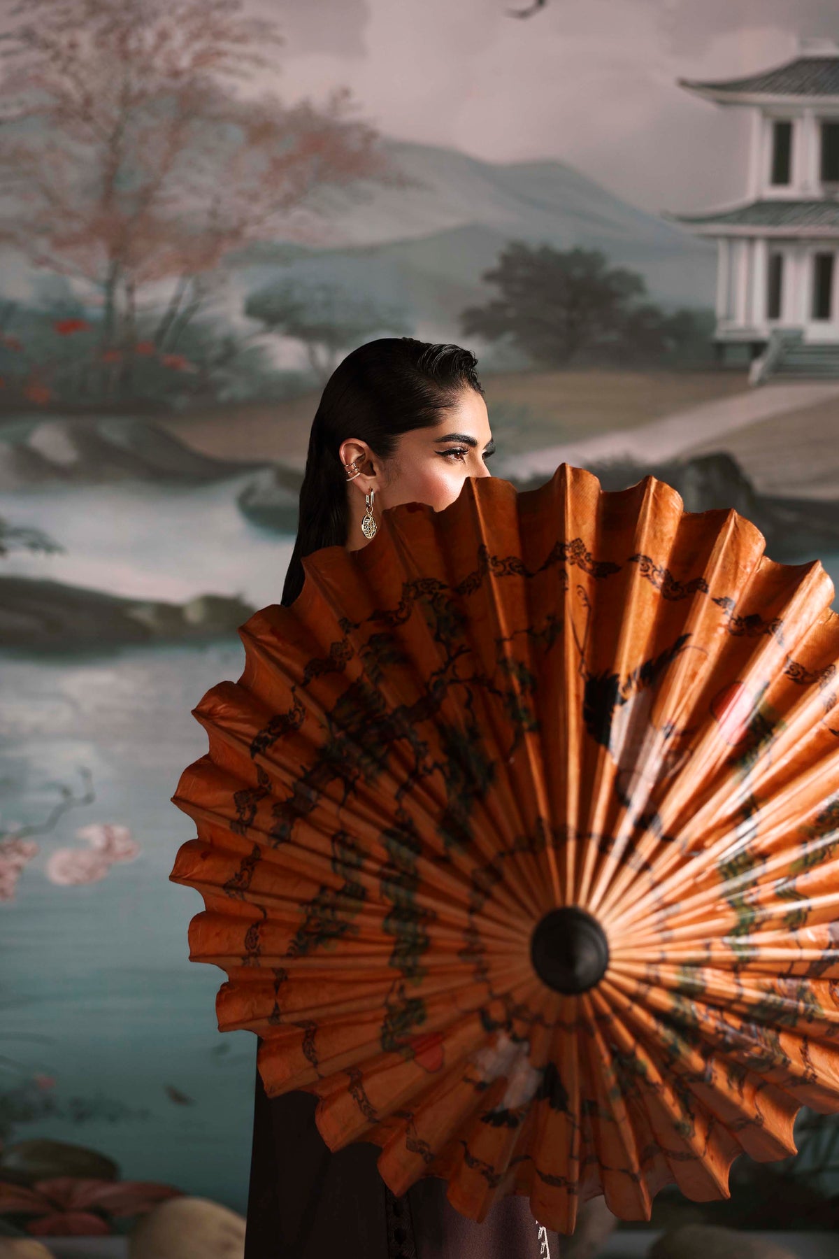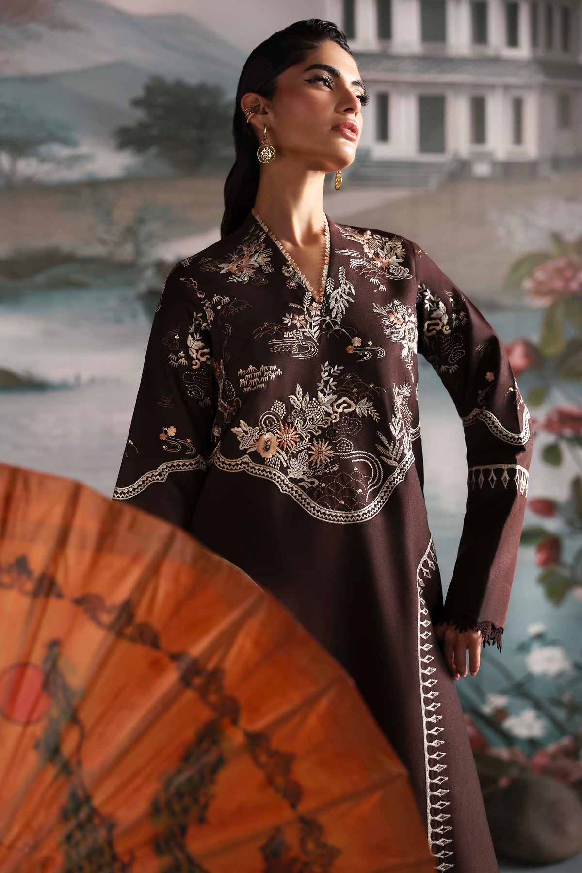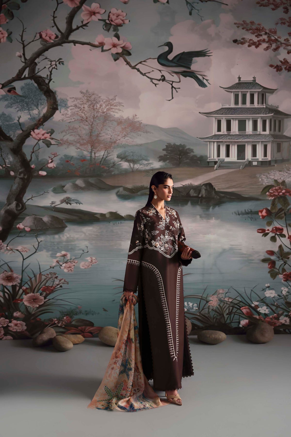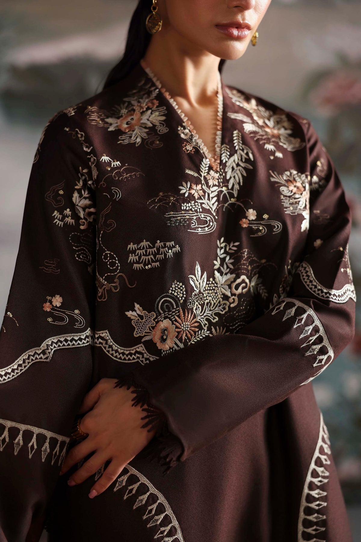 A rich chocolate brown ensemble crafted from thick winter silk fabric, exuding warmth and sophistication. Paired with an imported 100% silk-wool shawl featuring traditional Nikko Shishi Japanese embroidery. A beautifully designed luxury pret 3-piece for timeless elegance. (Imported fabric)