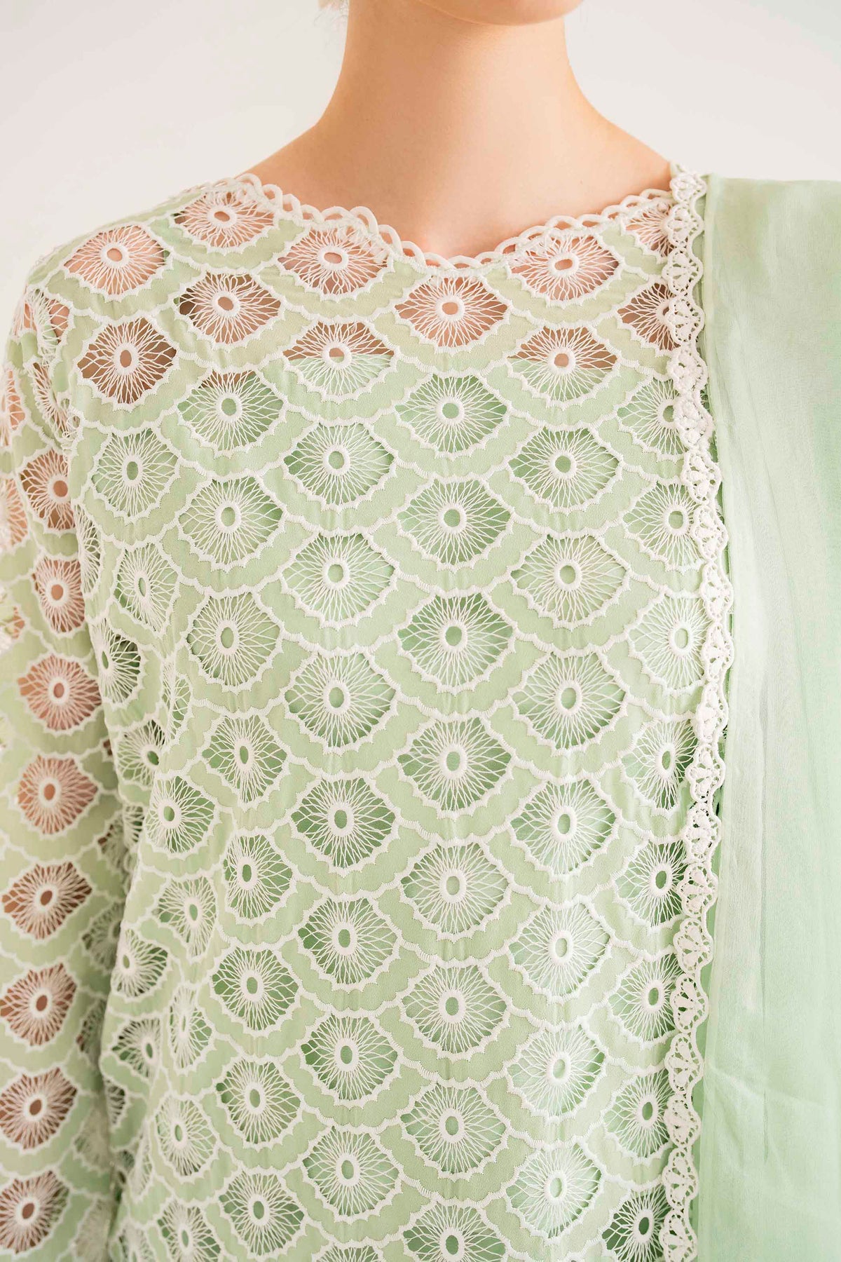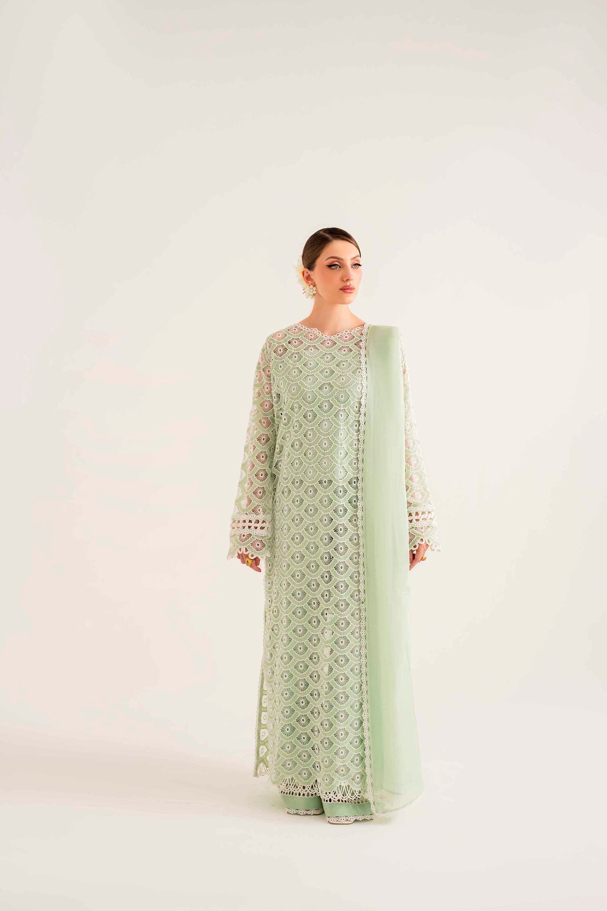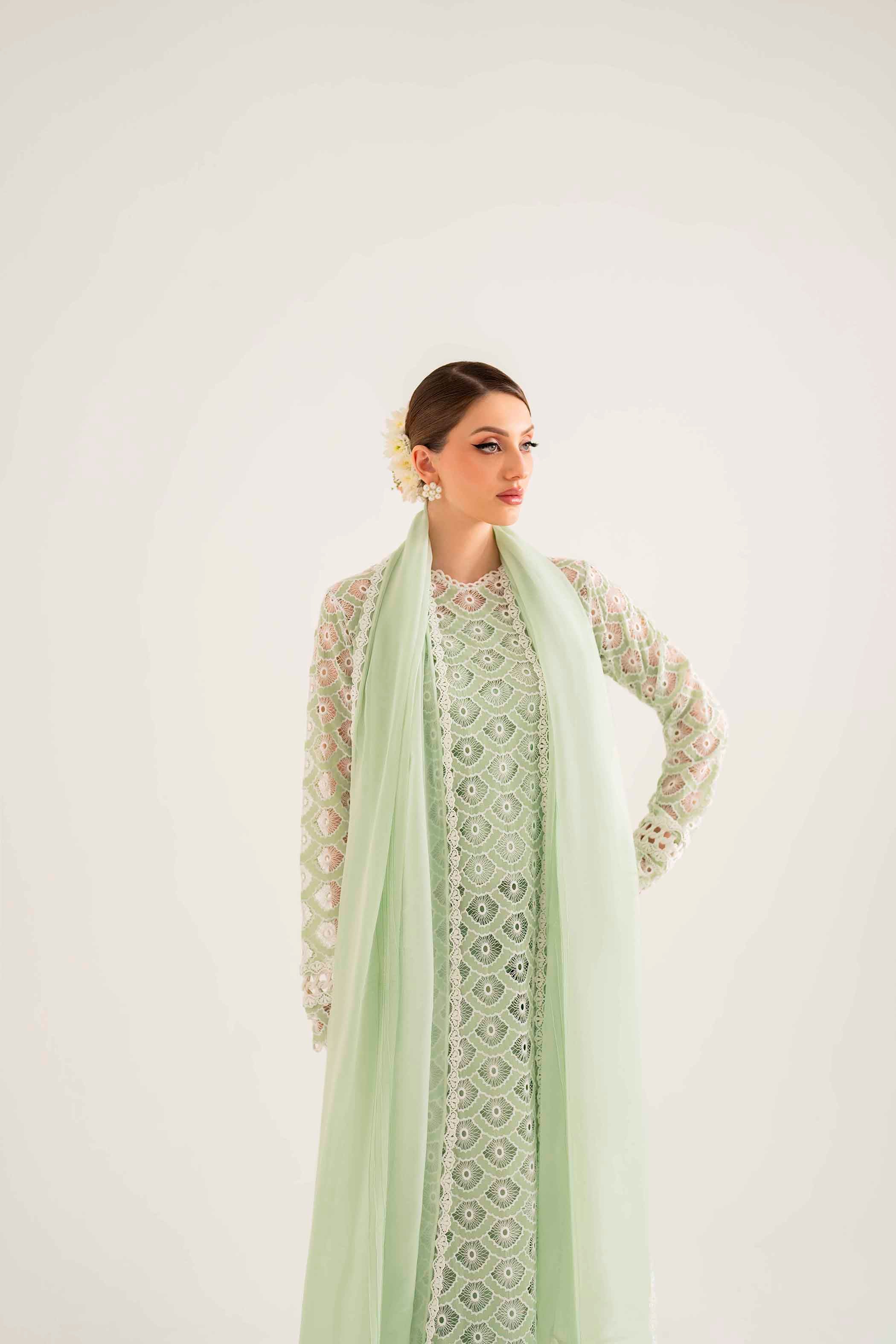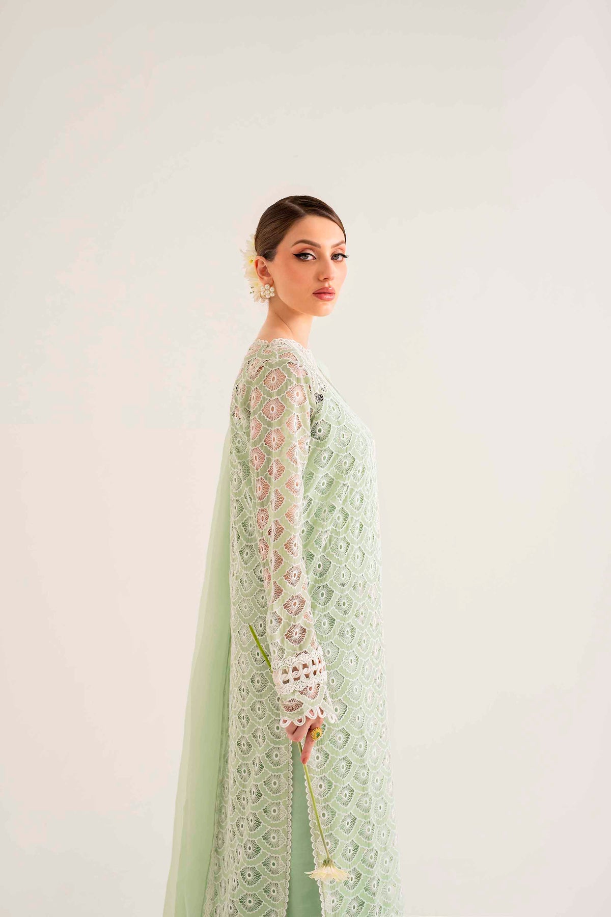 Beautifully crafted Schiffli and laser embroidery on organza with rhinestones scattered in different areas of the long shirt immaculate hand-crafted stitching details on sleeves and neckline.