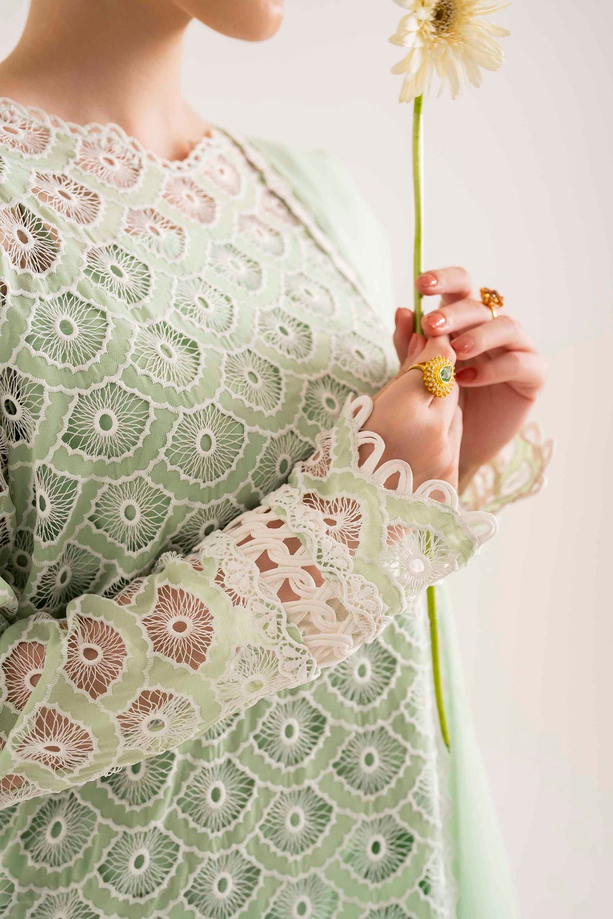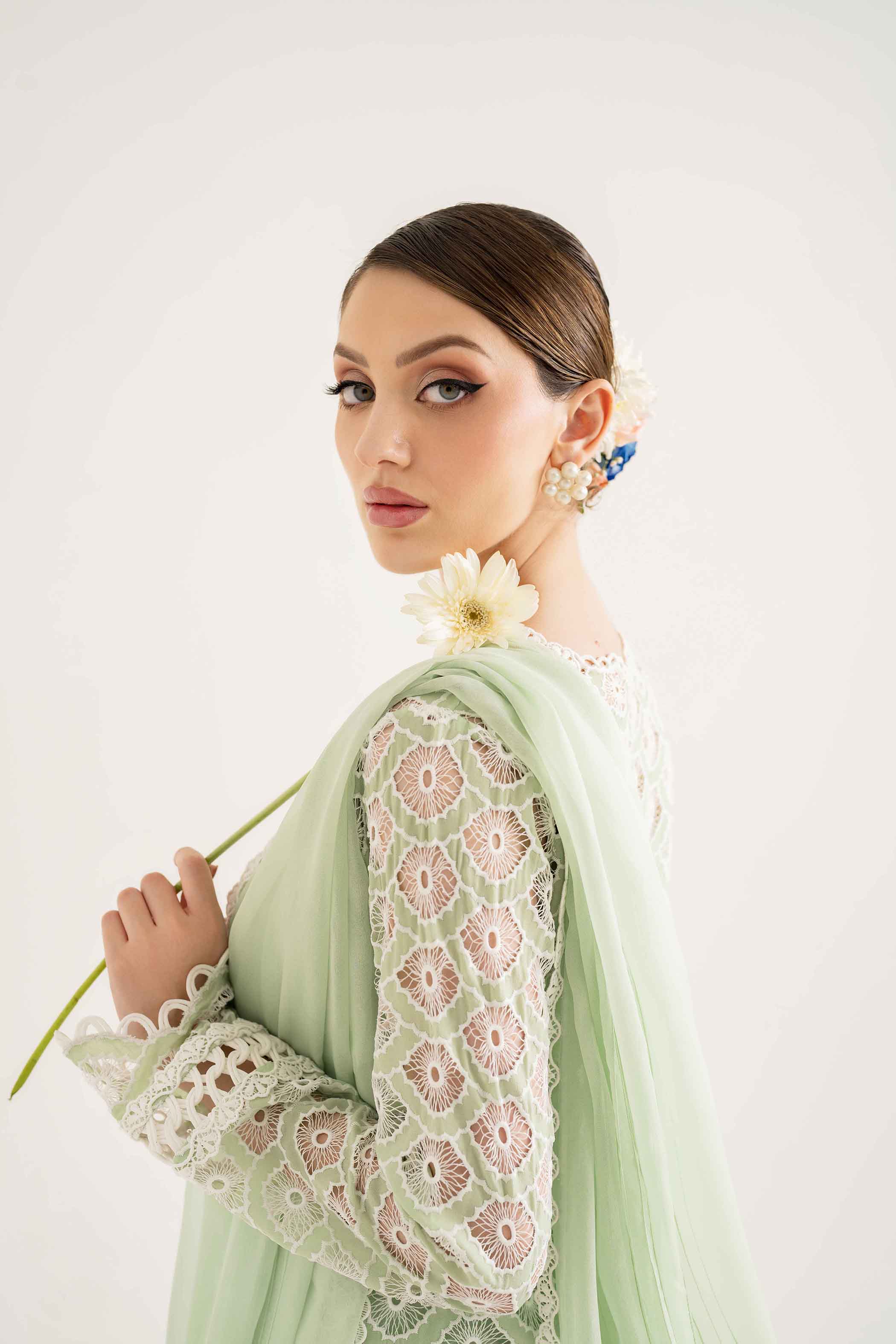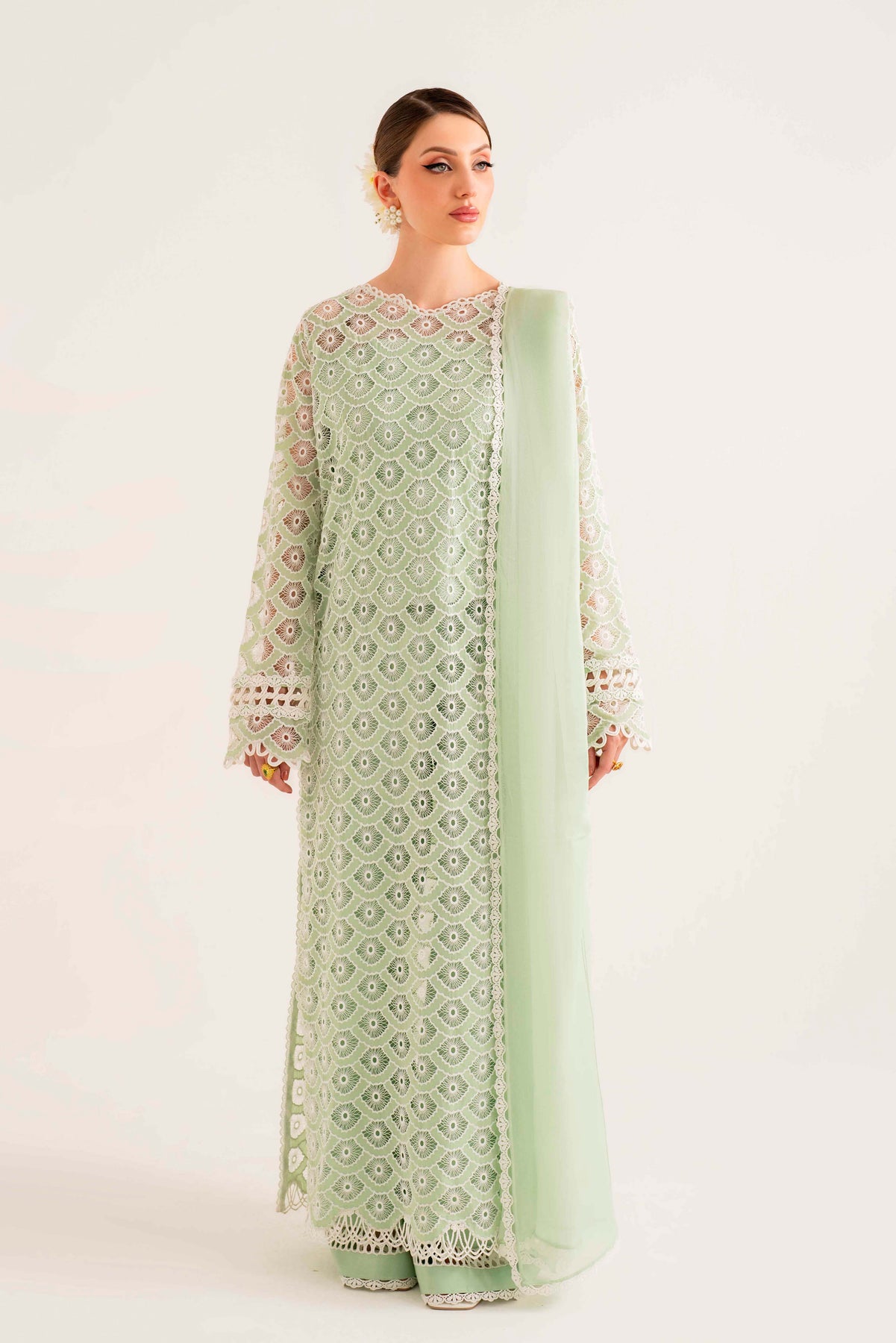 Beautifully crafted Schiffli and laser embroidery on organza with rhinestones scattered in different areas of the long shirt immaculate hand-crafted stitching details on sleeves and neckline.