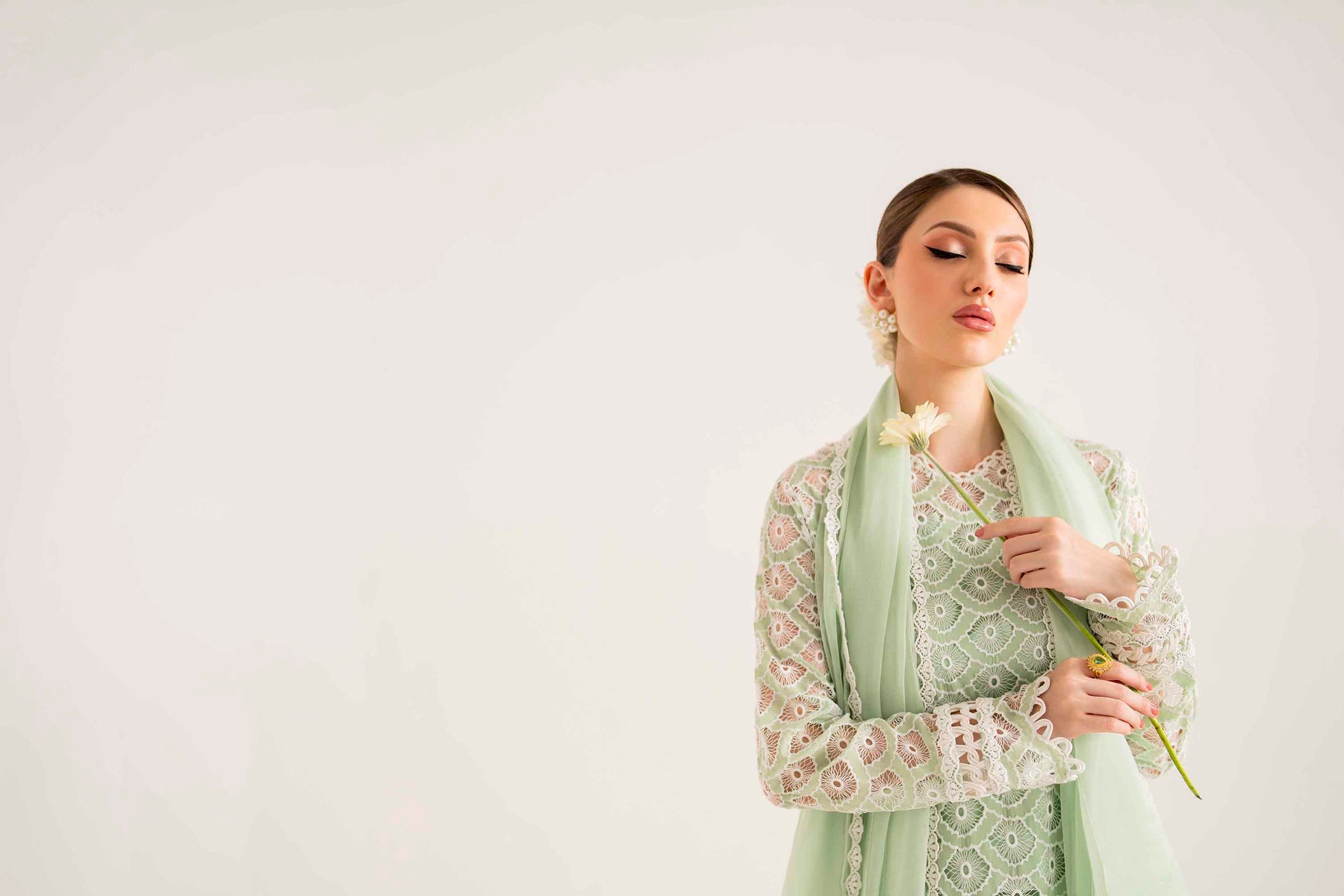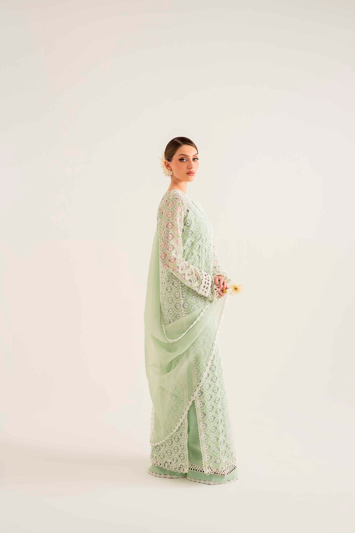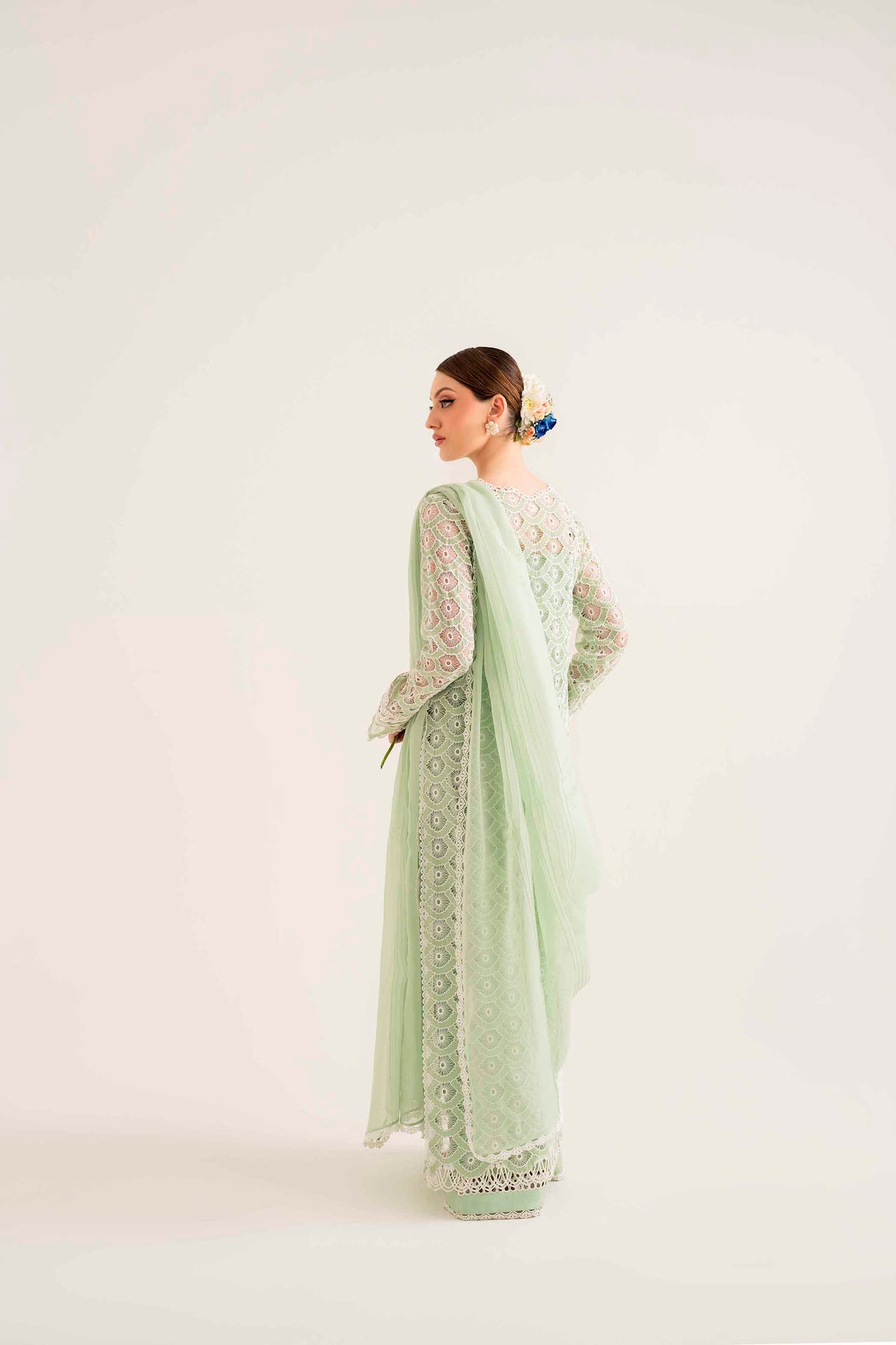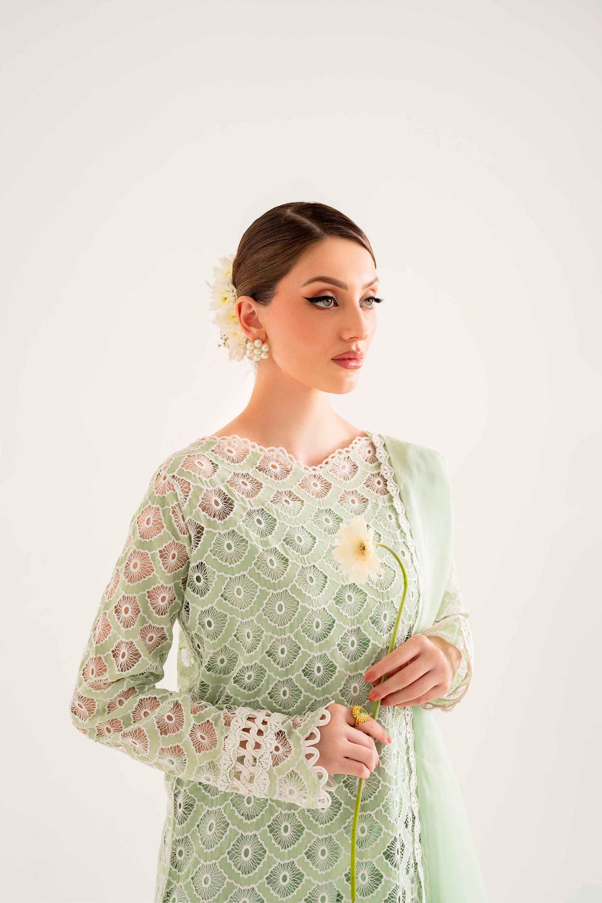 Beautifully crafted Schiffli and laser embroidery on organza with rhinestones scattered in different areas of the long shirt immaculate hand-crafted stitching details on sleeves and neckline.