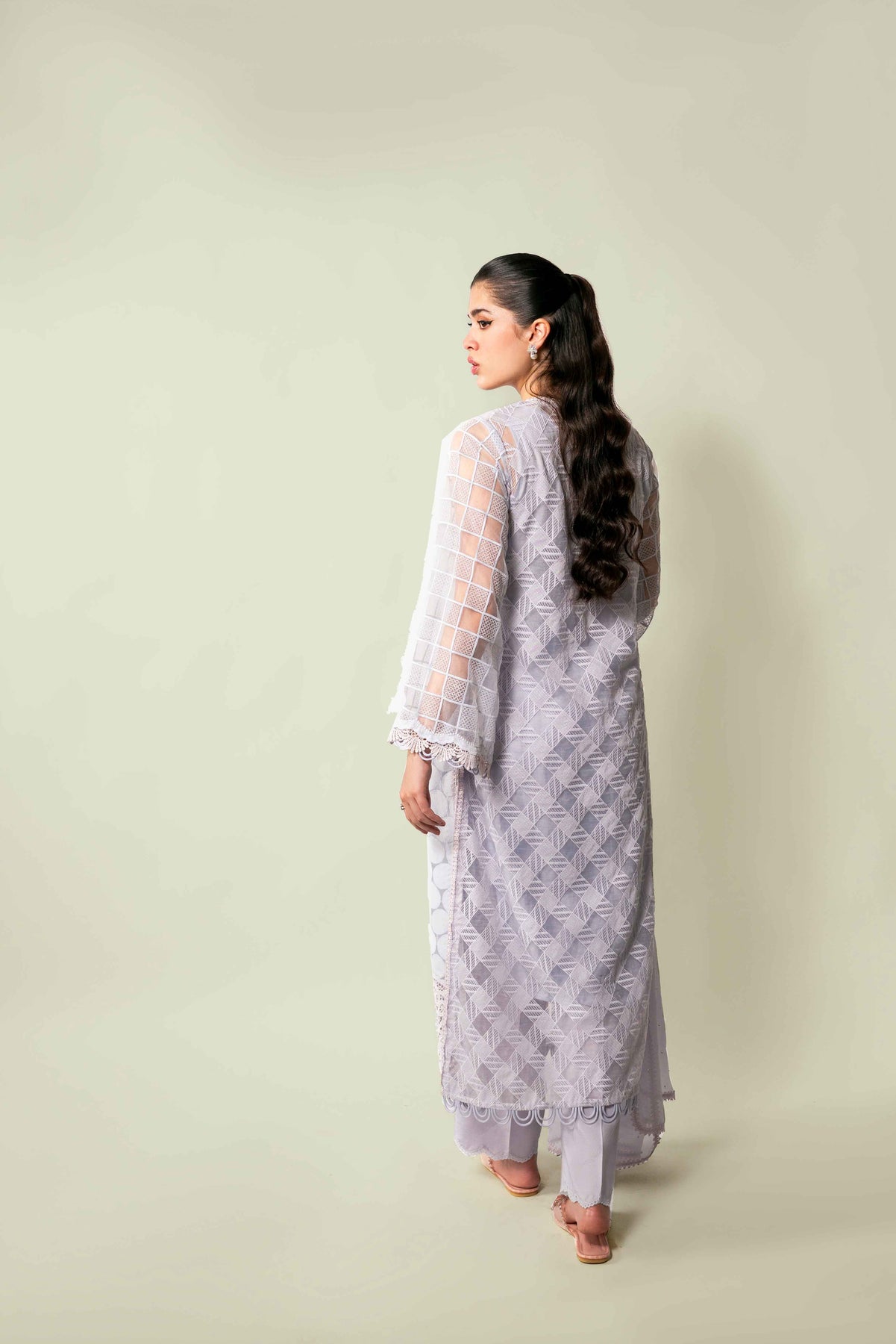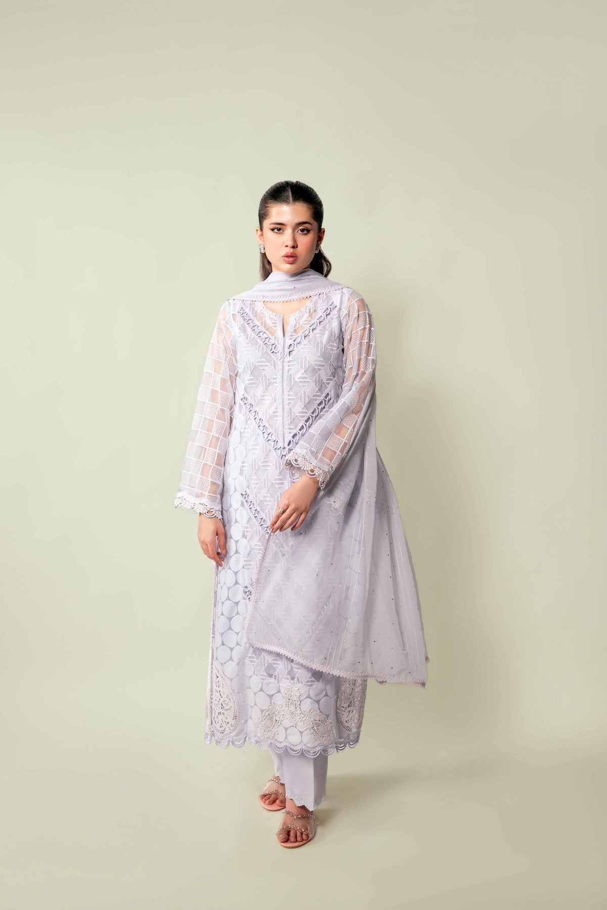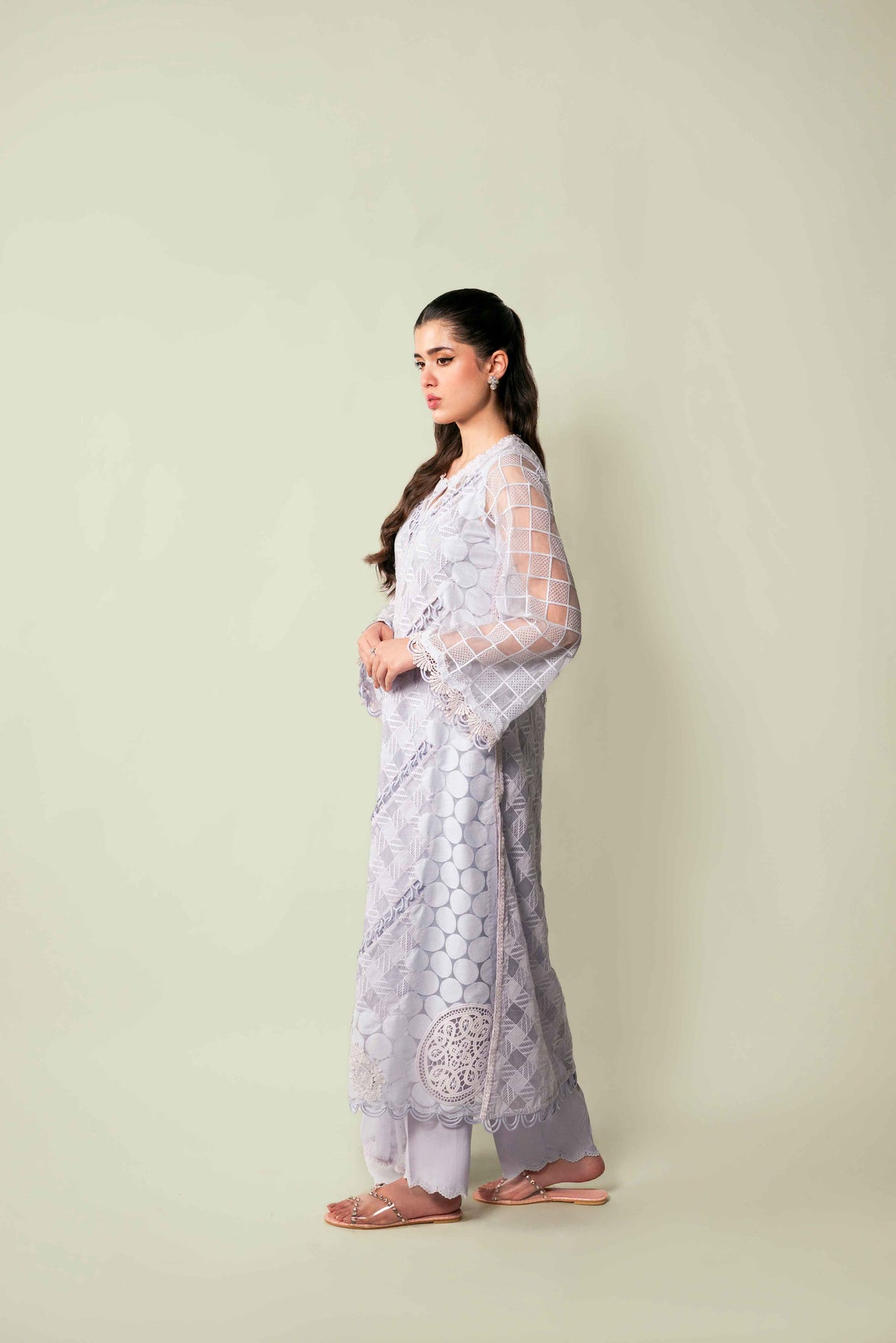 Pure cotton organza with immaculate time taking Dori stitching details (All handmade) with laces motives on daman. Organza has self on self-embroidery in center. Centre and side panels of different embroidery patterns. color is light lilac.
