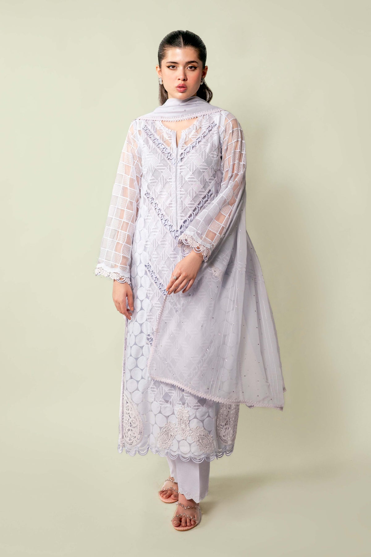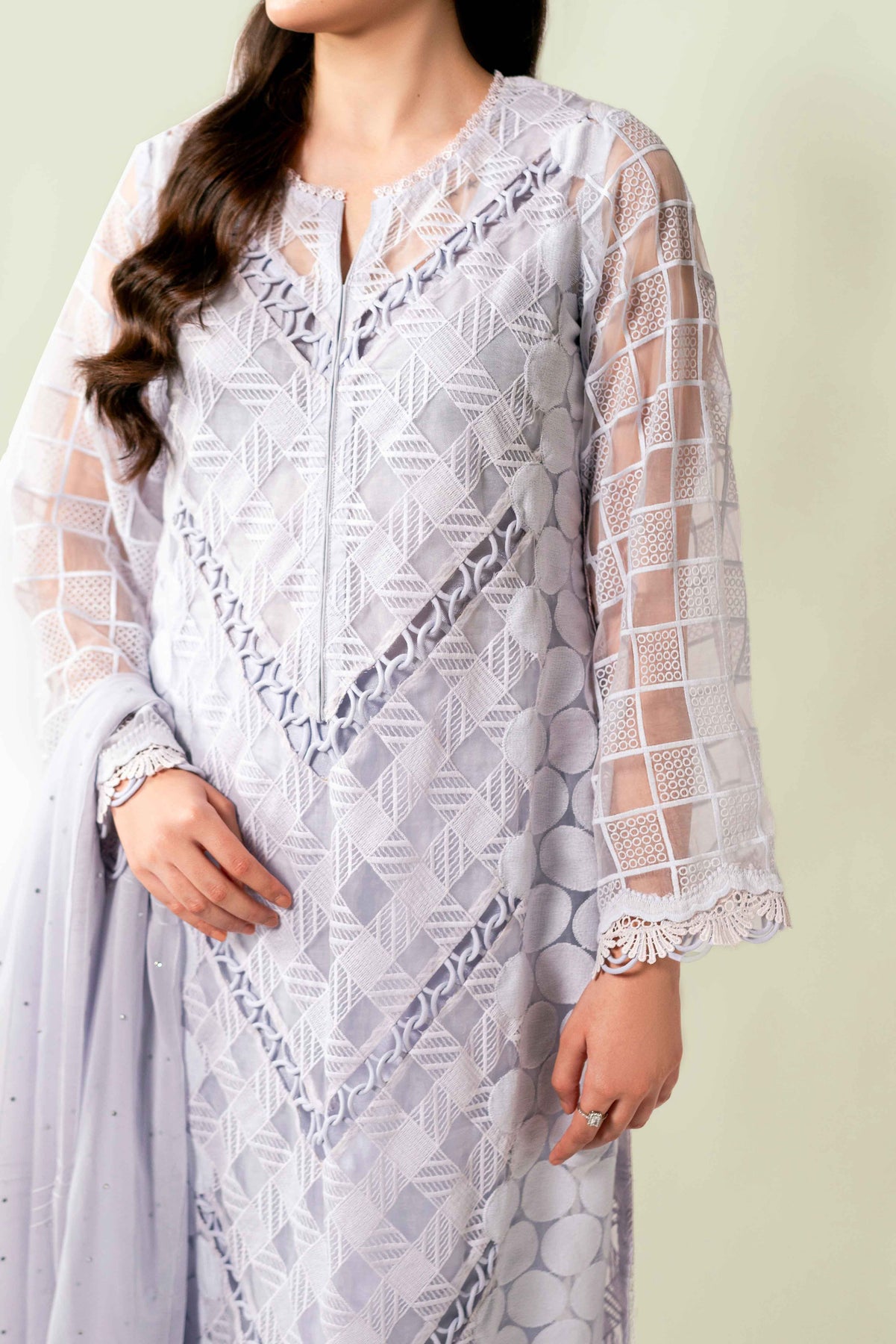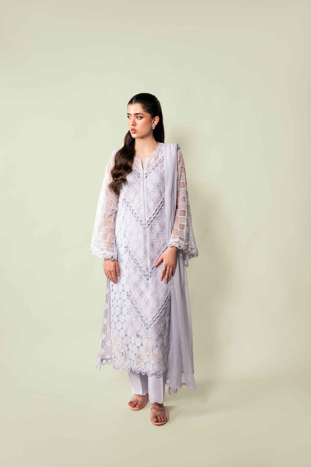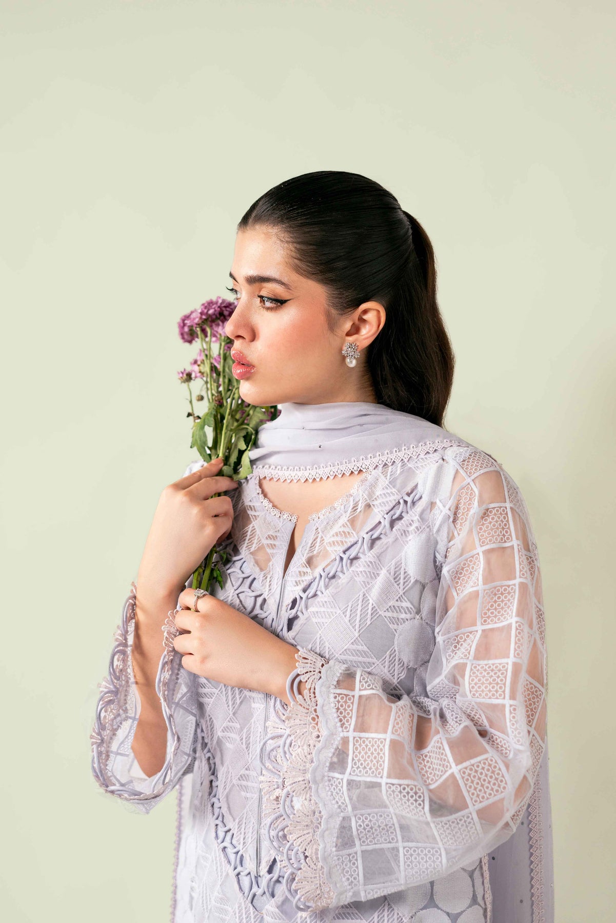 Pure cotton organza with immaculate time taking Dori stitching details (All handmade) with laces motives on daman. Organza has self on self-embroidery in center. Centre and side panels of different embroidery patterns. color is light lilac.