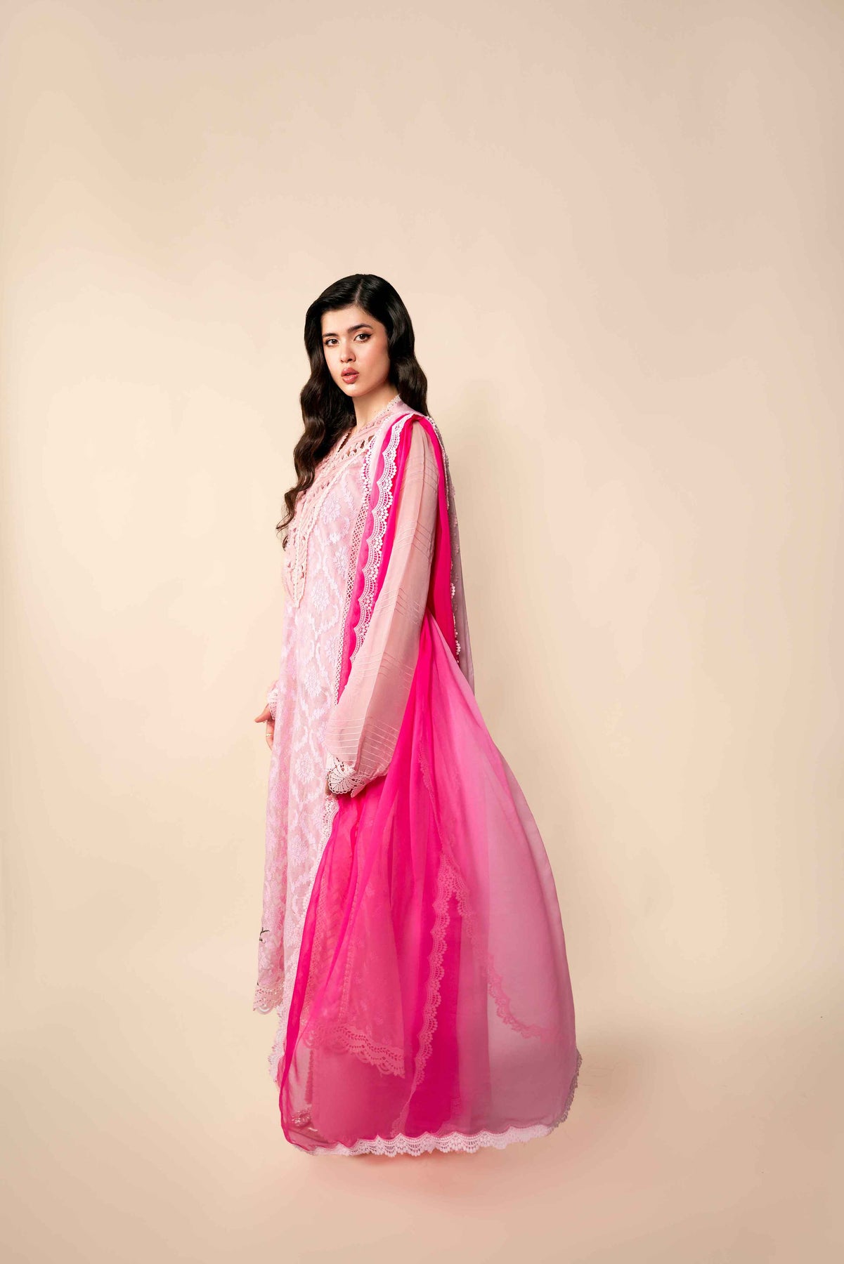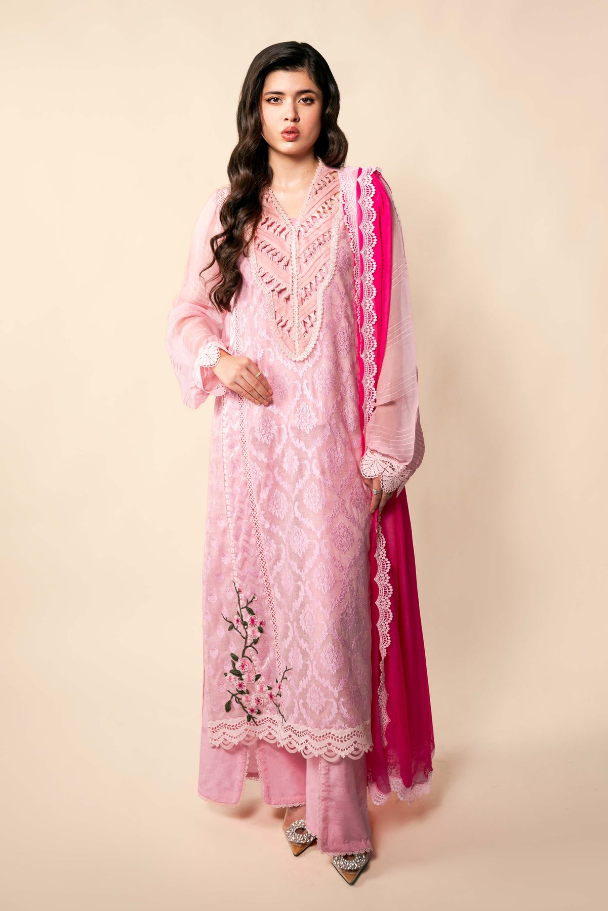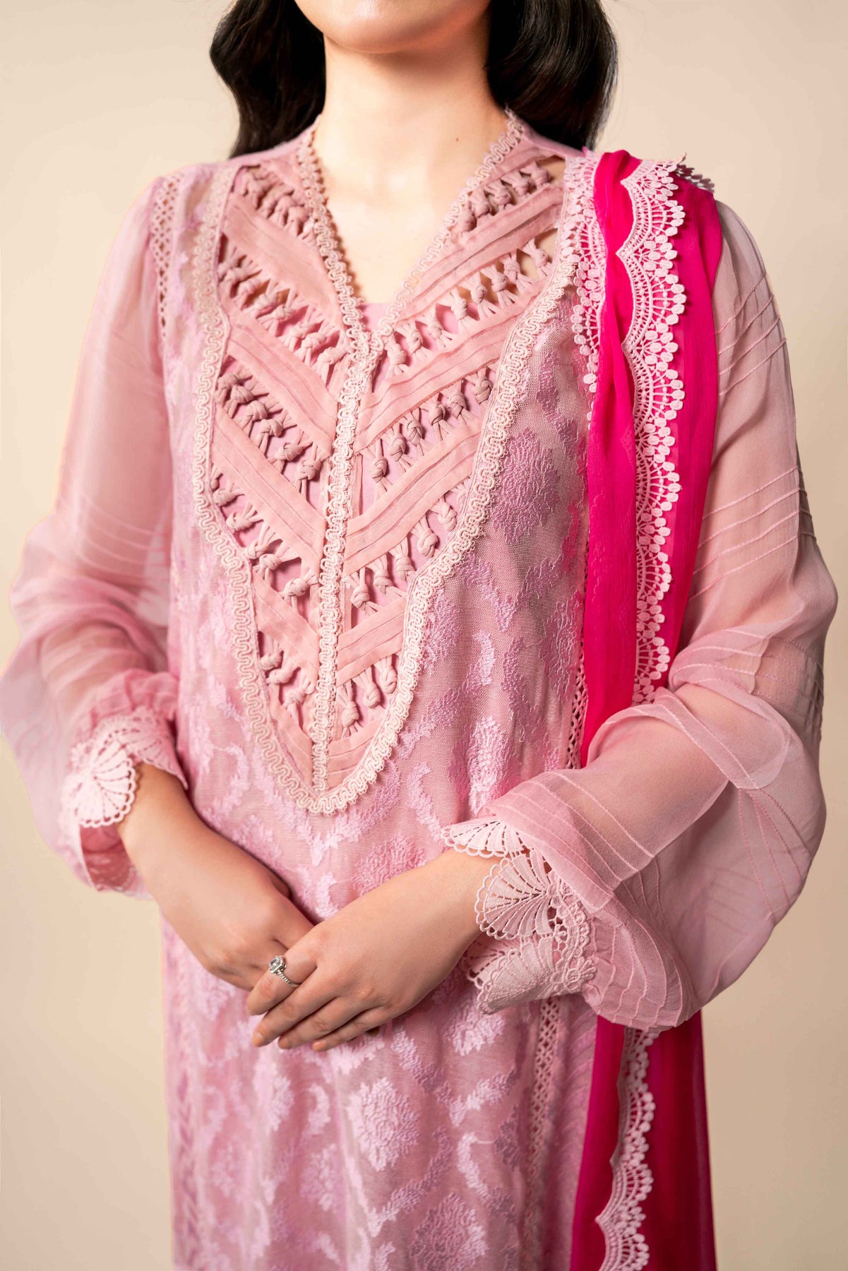 Body pink silk cotton net, with Baroque self on self embroidery. Shirt is enhanced with laces stitching details, showcase exceptional craftsmanship.