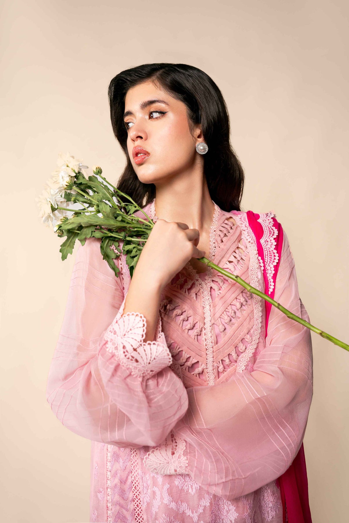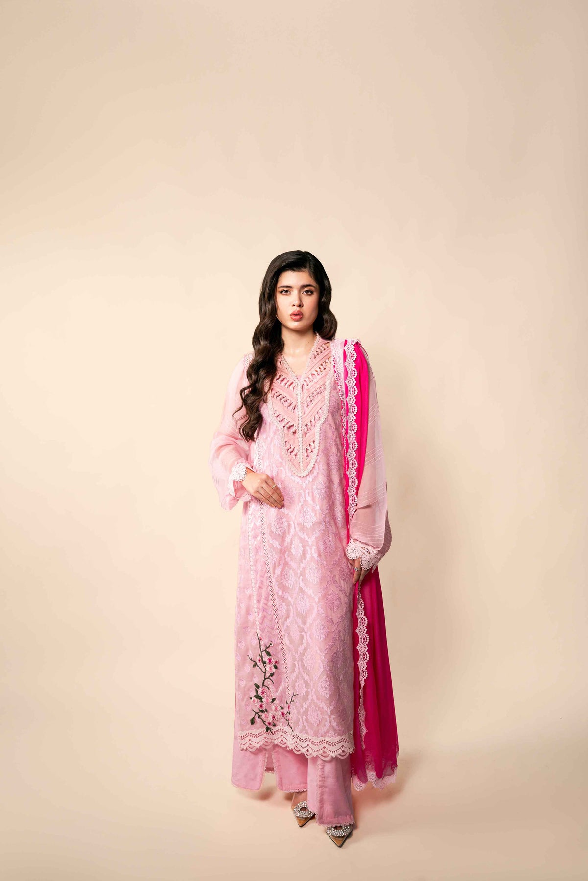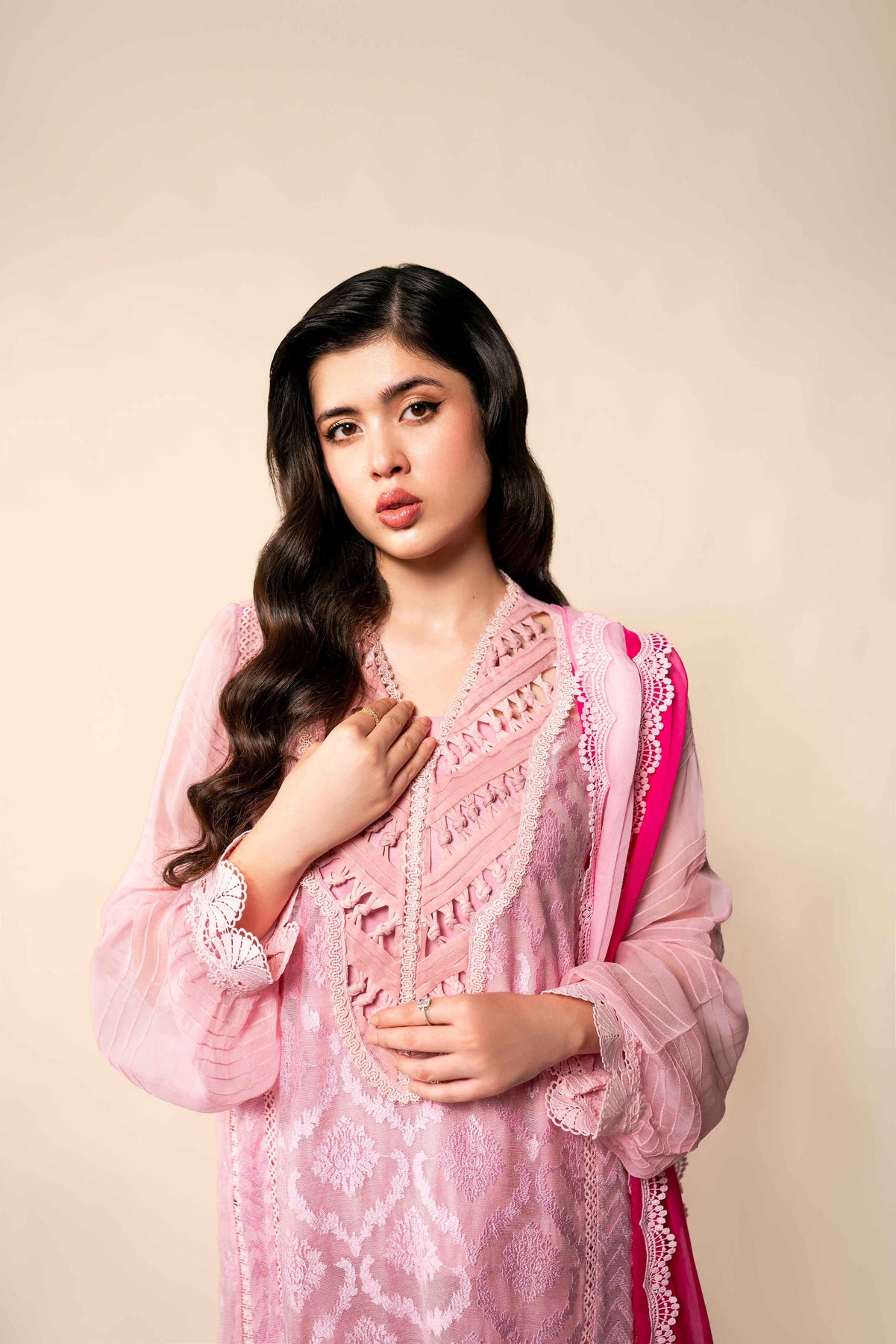 Body pink silk cotton net, with Baroque self on self embroidery. Shirt is enhanced with laces stitching details, showcase exceptional craftsmanship.