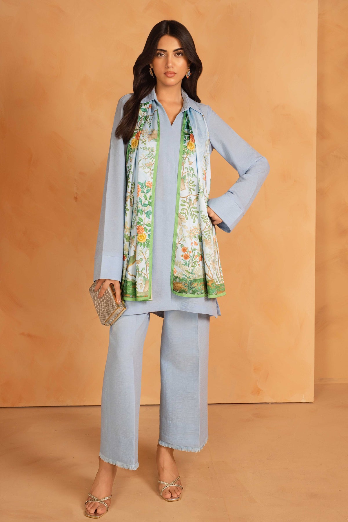 This refreshing ensemble, made from winter georgette fabric, offers a soft, structured drape in a delicate pastel blue hue. The look is stylishly completed by a contrasting digital silk scarf draped over the shoulders, featuring a vibrant, multicolored floral print with a crisp green border.