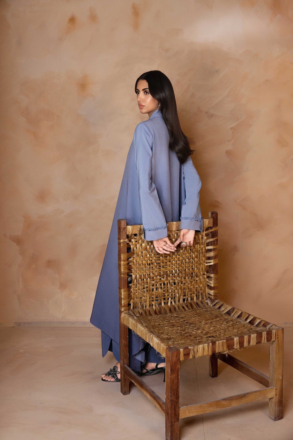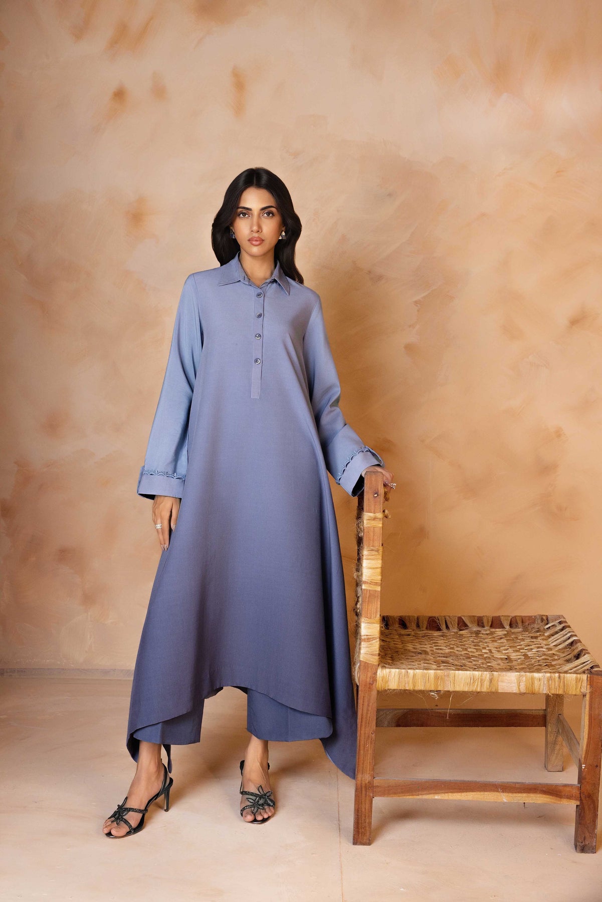 Crafted from pure viscose crepe, this elegant ensemble showcases a unique ombré effect, graduating from a soft to a deep dusty blue. The long, flowing tunic features a buttoned placket and collared neckline, with delicate stitching detail adorning the cuffs.