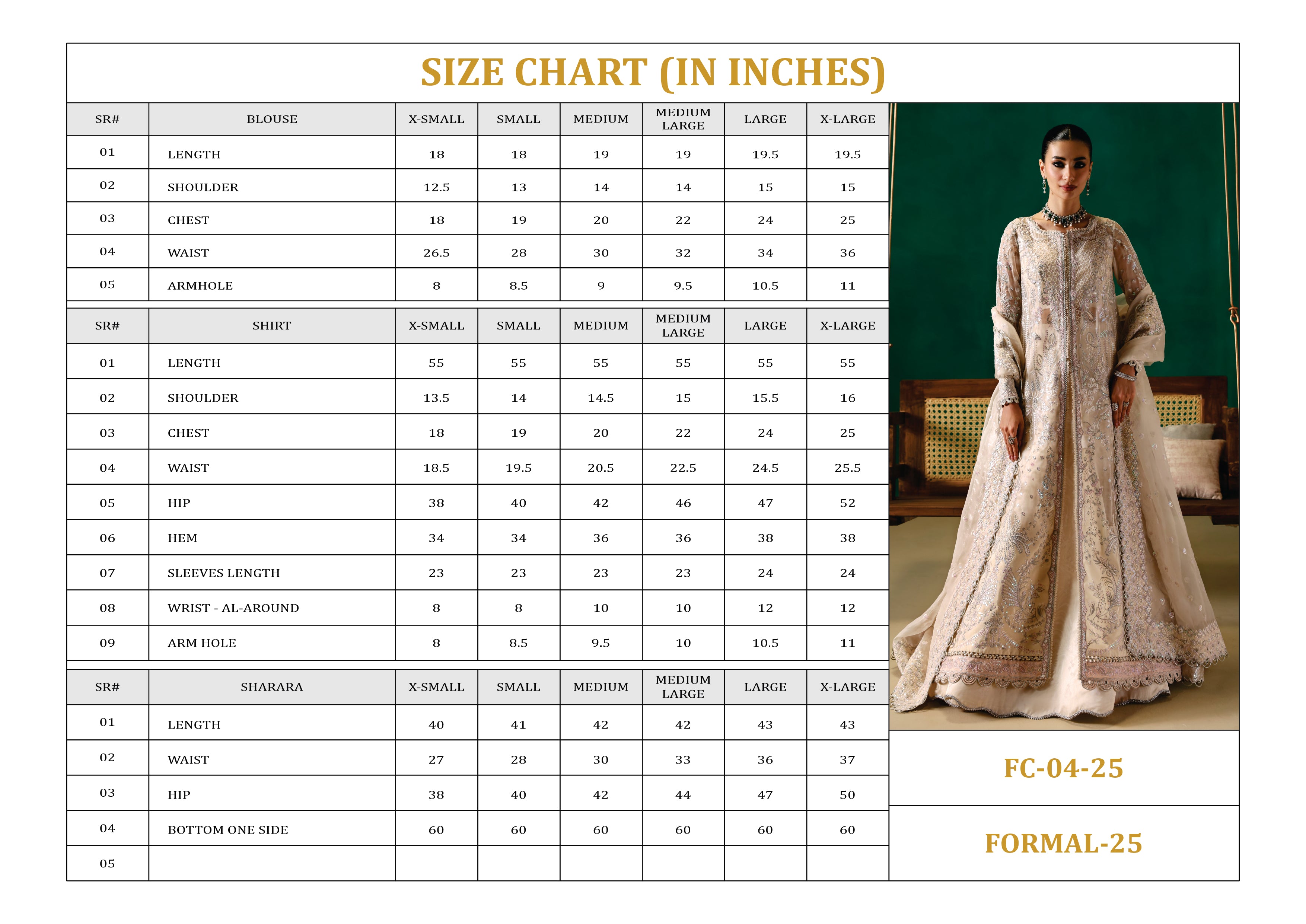 1. EMBROIDERED WITH EMBELISHMENT LEFT PANEL-1 ON DYED ORGANZA 01 2. EMBROIDERED LEFT PANEL-2 ON DYED SILK 01 3. EMBROIDERED LEFT PANEL-3 ON DYED SILK 01 4. EMBROIDERED WITH EMBELISHMENT RIGHT PANEL-1 ON DYED ORGANZA 01 5. EMBROIDERED RIGHT PANEL-2 ON DYED SILK 01 6. EMBROIDERED RIGHT PANEL-3 ON DYED SILK 01 7. EMBROIDERED FRONT DAMAN BORDER ON DYED SILK 1-M 01 8. EMBROIDERED FRONT OPEN BORDER ON DYED SILK 3-M 01 9. EMBROIDERED BACK ON DYED ORGANZA 60" 01 10. EMBROIDERED BACK DAMAN BORDER ON DYED SILK 1-M 01 11. EMBROIDERED SLEEVES ON DYED ORGANZA 52" 01 12. EMBROIDERED SLEEVES BORDER ON DYED SILK 52" 01 13. EMBROIDERED SLEEVES BORDER ON DYED SILK 52" 01 14. EMBROIDERED DUPATTA ON DYED ORGANZA 2.5-M 01 15. EMBROIDERED DUPATTA PALLU LEFT & RIGHT ON DYED ORGANZA 2-M 01 16. PRINTED MAXI ON SILK FABRIC 4.5 M 01