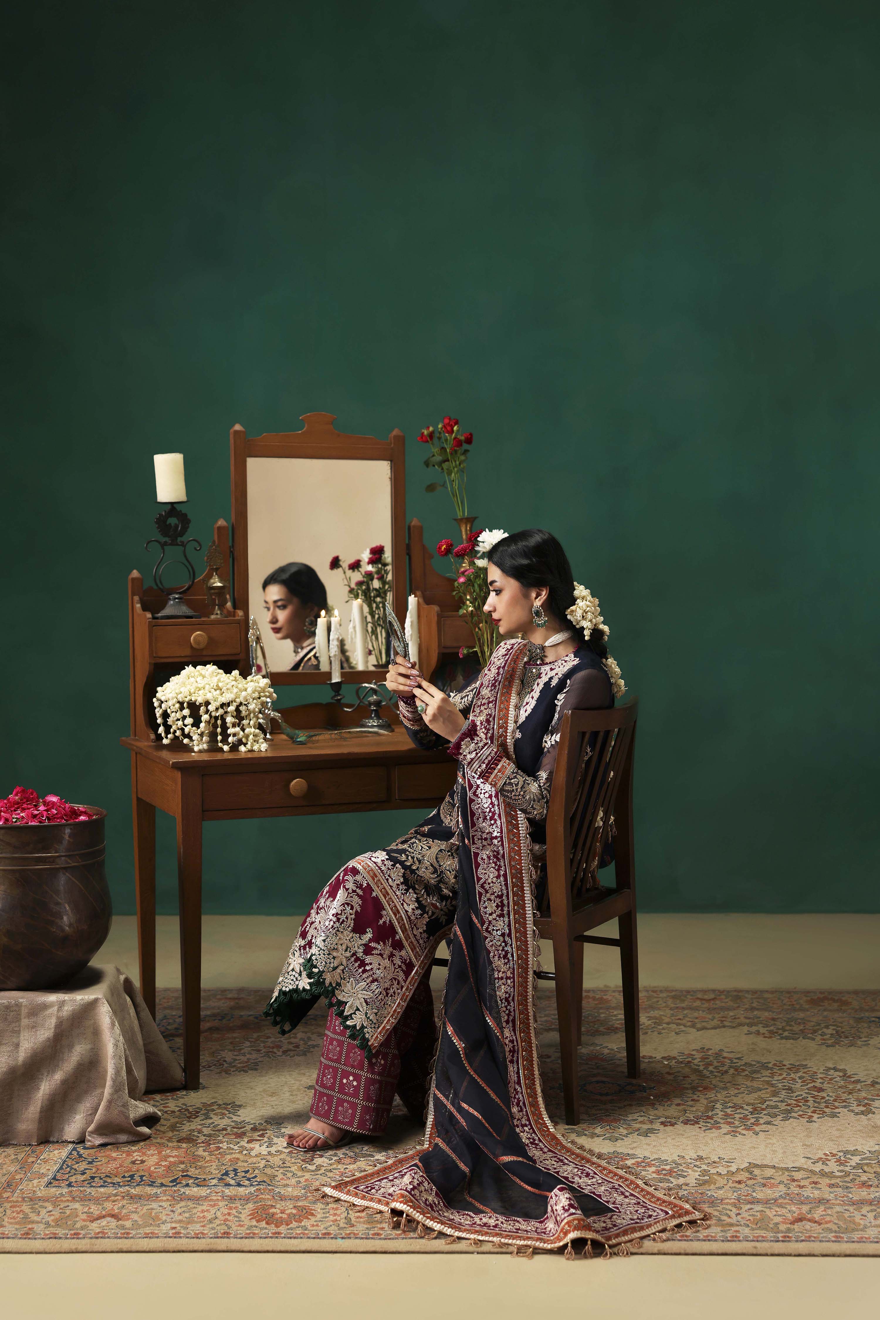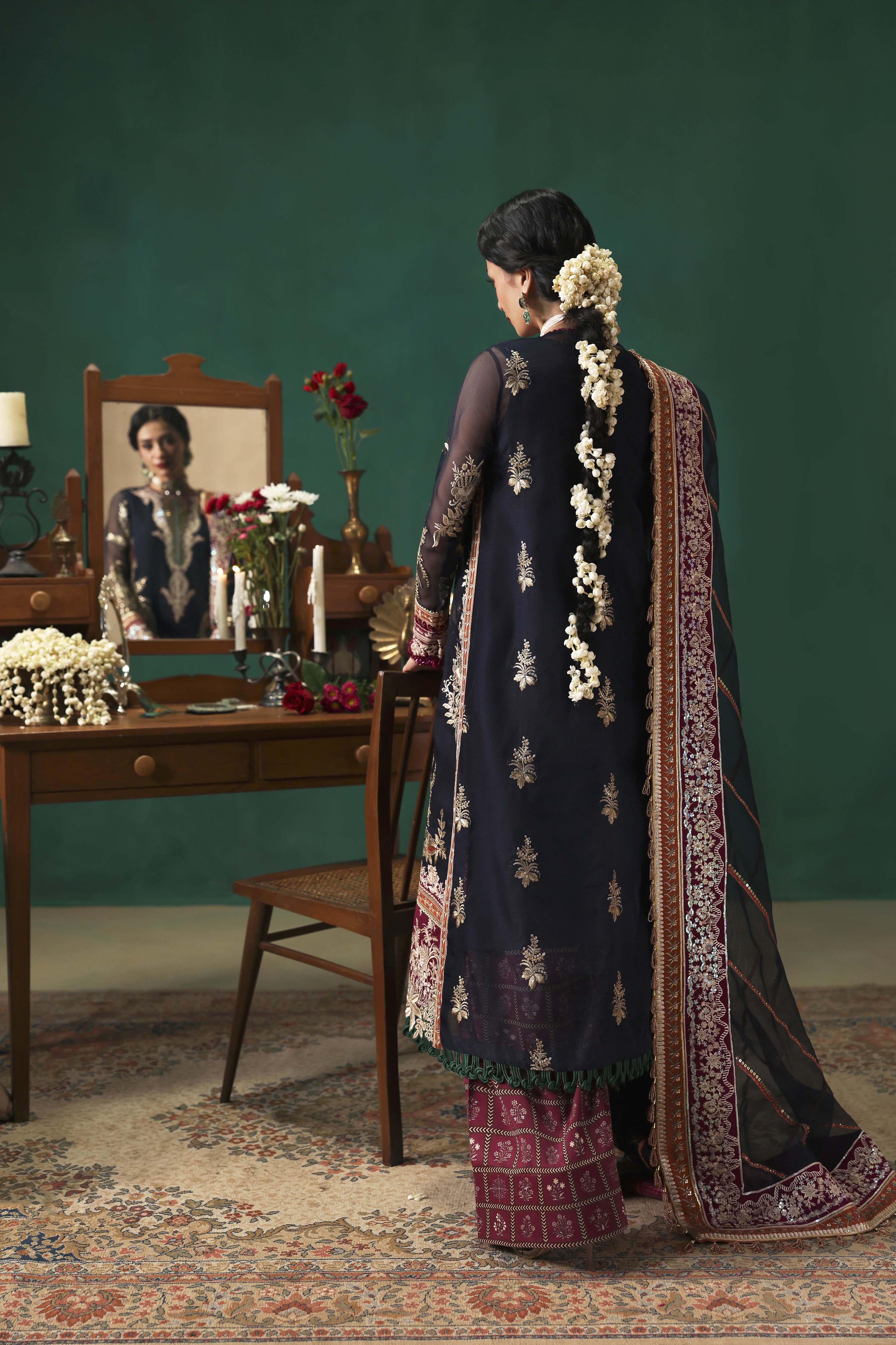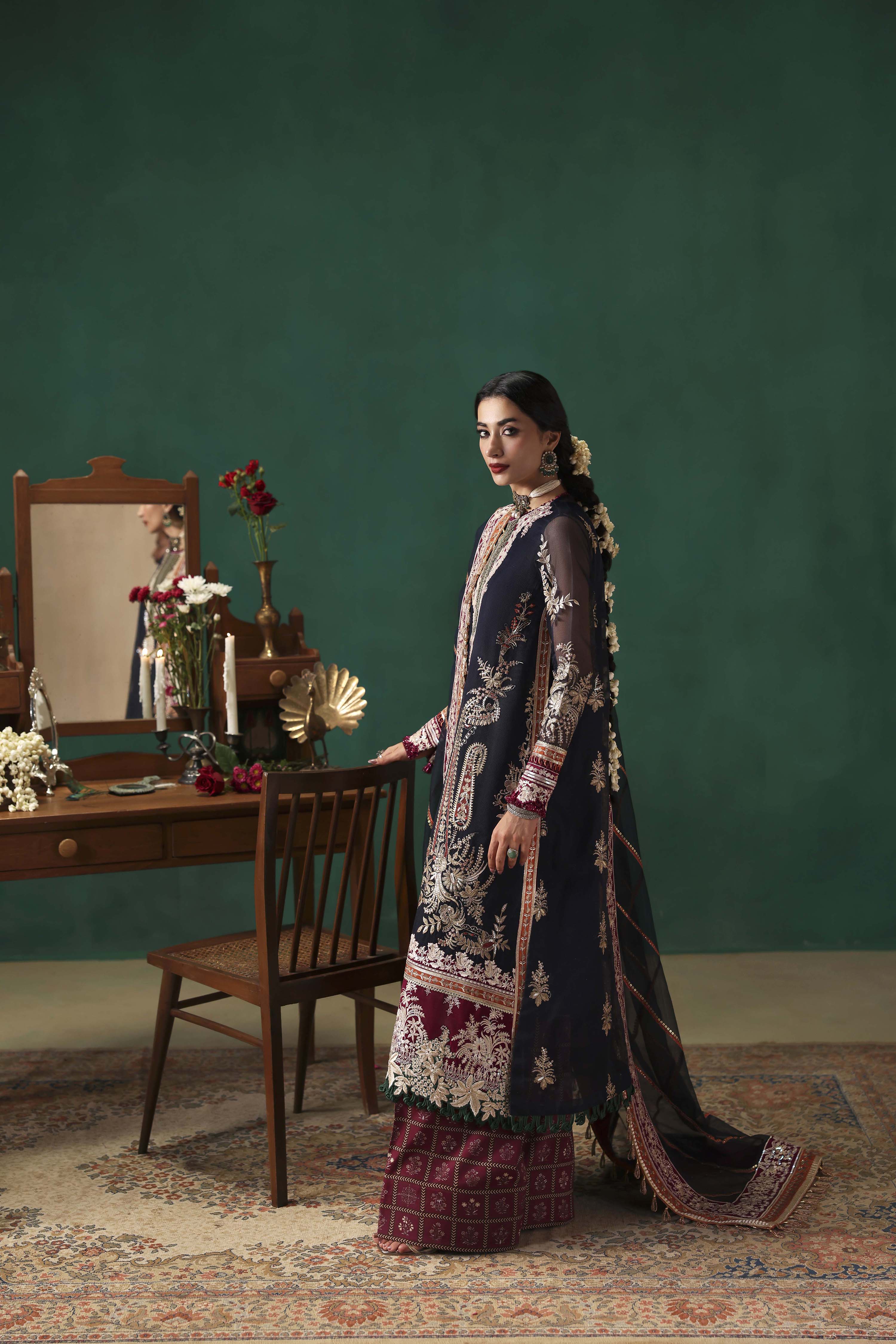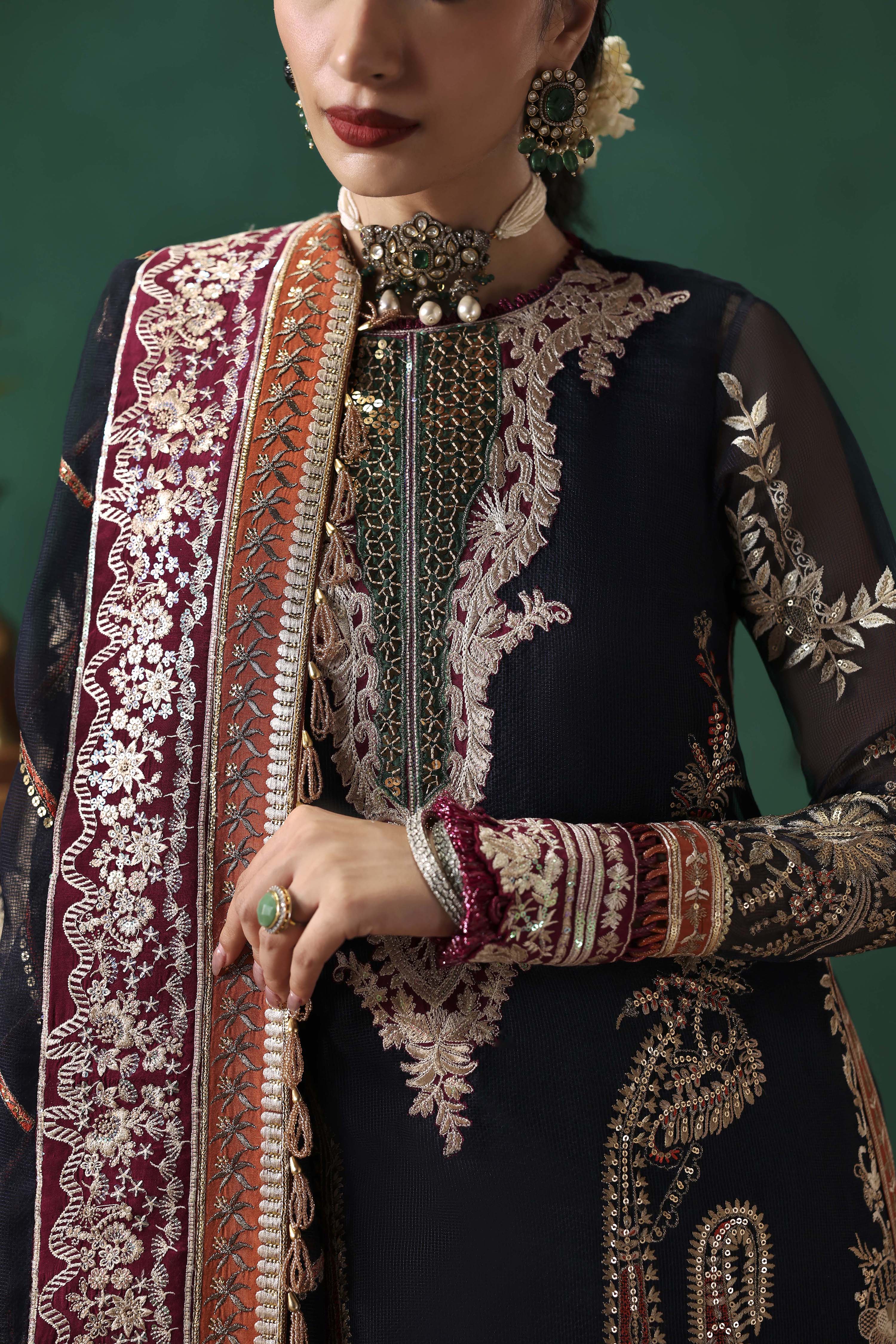EMBROIDERED FRONT ON DYED NAVY BLUE NET FABRIC 26" 01 2. EMBROIDERED FRONT BORDER-1 ON DYED SILK 01 3. EMBROIDERED FRONT BORDER-2 ON DYED SILK 01 4. EMBROIDERED NECKLINE-1 ON DYED SILK 01 5. EMBROIDERED NECKLINE-2 ON DYED SILK 01 6. EMBROIDERED PATTI ON DYED SILK 5-M 01 7. EMBROIDERED FRONT SIDE KALI & BACK ON DYED NET NAVY BLUE FABRIC 52"01 8. EMBROIDERED SLEEVES ON DYED NAVY BLUE NET FABRIC 26" 01 9. EMBROIDERED SLEEVES PATTI ON DYED SILK 1-M 01 10. EMBROIDERED SLEEVES BORDER ON DYED SILK 1-M 01 11. EMBROIDERED DUPATTA ON DYED NAVY BLUE NET FABRIC 2.5-M 01 12. EMBROIDERED DUPATTA PATTI ON DYED SILK 8-M 01 13. EMBROIDERED DUPATTA BORDER ON DYED SILK 8-M 01 14. DYED (NAVY BLUE) INNER ON SILK FABRIC 2-M 01 15. PRINTED TROUSER ON CREPE SILK FABRIC 2.75-M 01