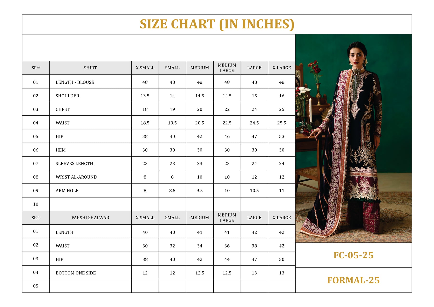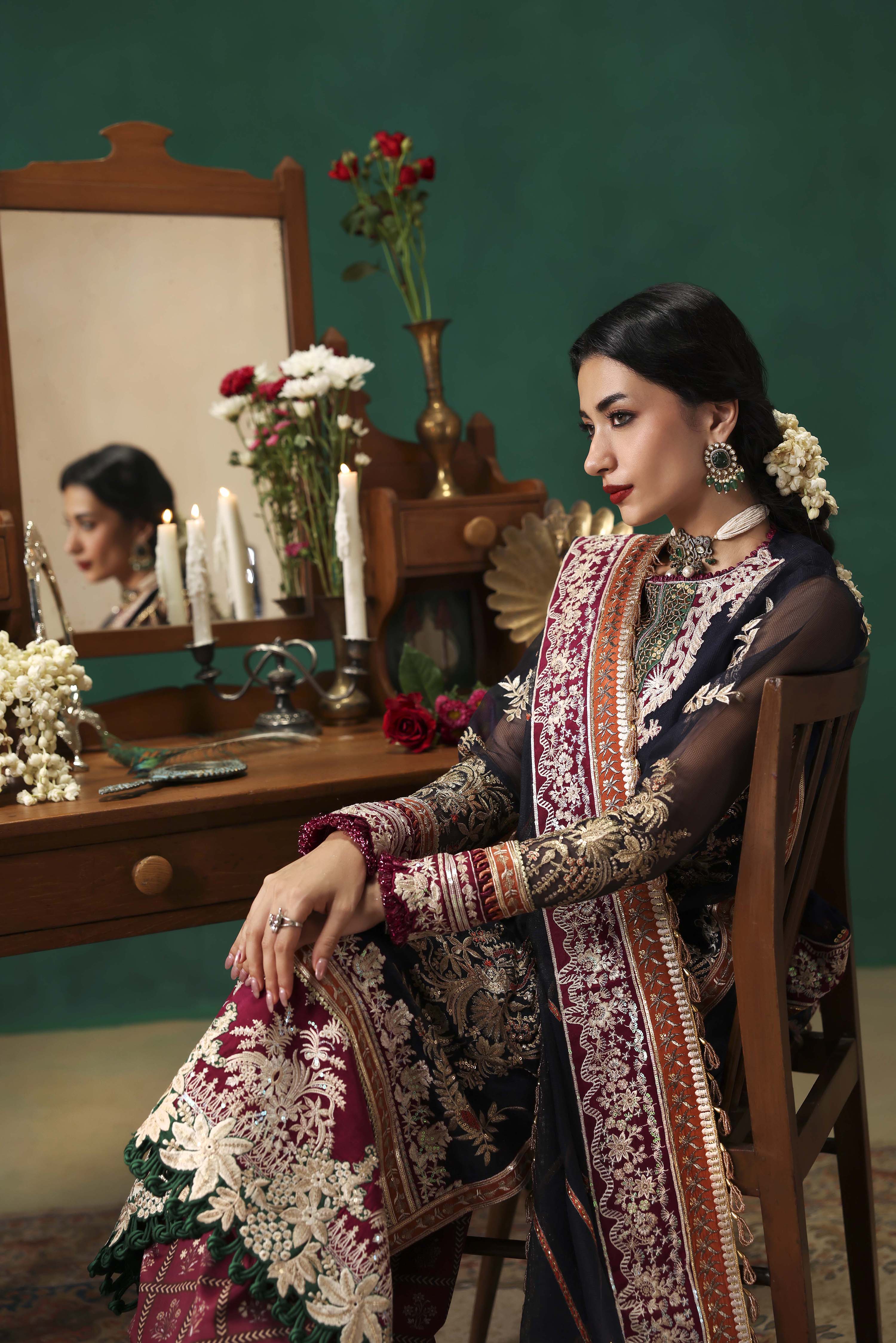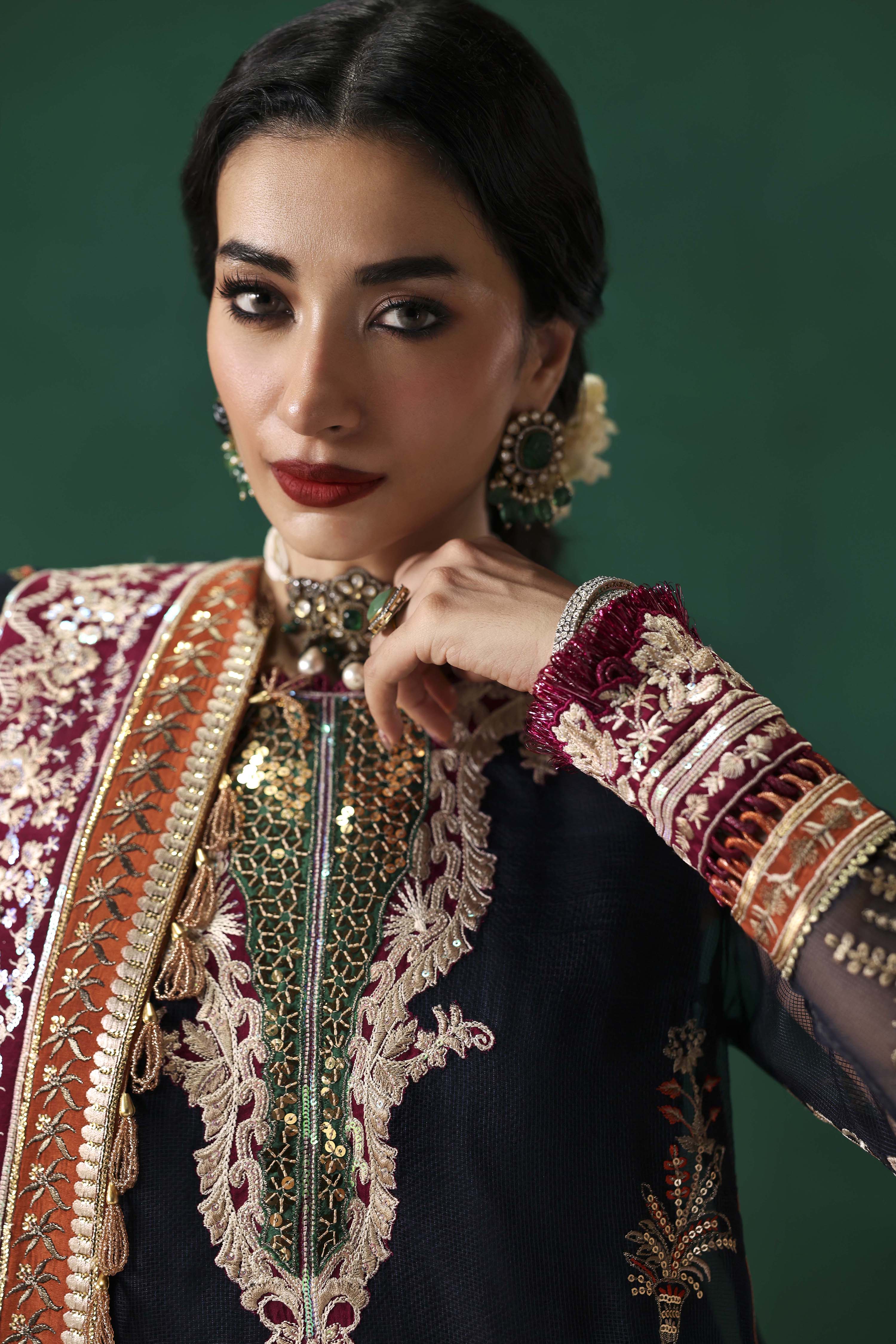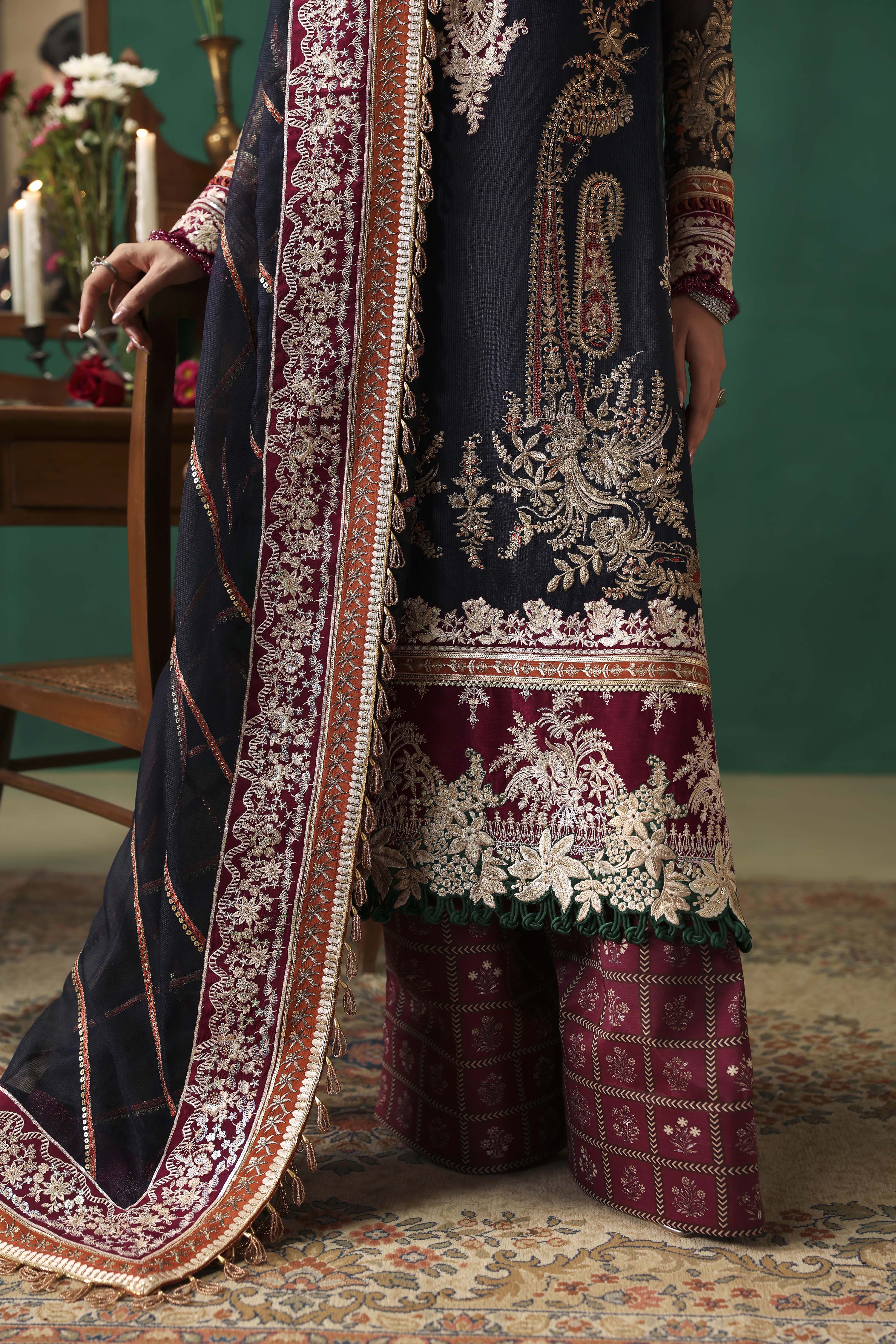 EMBROIDERED FRONT ON DYED NAVY BLUE NET FABRIC 26" 01 2. EMBROIDERED FRONT BORDER-1 ON DYED SILK 01 3. EMBROIDERED FRONT BORDER-2 ON DYED SILK 01 4. EMBROIDERED NECKLINE-1 ON DYED SILK 01 5. EMBROIDERED NECKLINE-2 ON DYED SILK 01 6. EMBROIDERED PATTI ON DYED SILK 5-M 01 7. EMBROIDERED FRONT SIDE KALI & BACK ON DYED NET NAVY BLUE FABRIC 52"01 8. EMBROIDERED SLEEVES ON DYED NAVY BLUE NET FABRIC 26" 01 9. EMBROIDERED SLEEVES PATTI ON DYED SILK 1-M 01 10. EMBROIDERED SLEEVES BORDER ON DYED SILK 1-M 01 11. EMBROIDERED DUPATTA ON DYED NAVY BLUE NET FABRIC 2.5-M 01 12. EMBROIDERED DUPATTA PATTI ON DYED SILK 8-M 01 13. EMBROIDERED DUPATTA BORDER ON DYED SILK 8-M 01 14. DYED (NAVY BLUE) INNER ON SILK FABRIC 2-M 01 15. PRINTED TROUSER ON CREPE SILK FABRIC 2.75-M 01