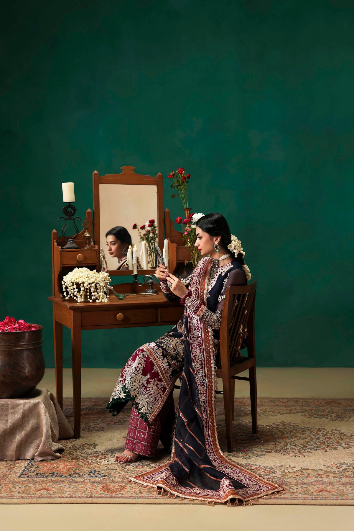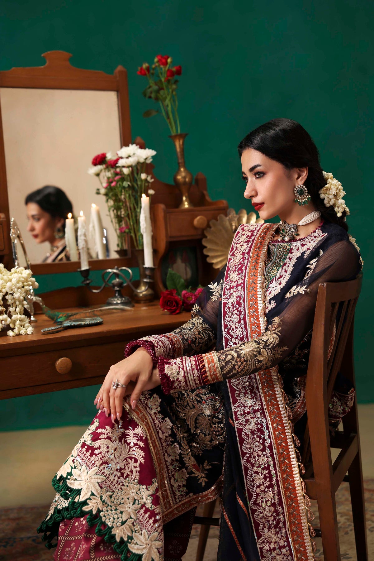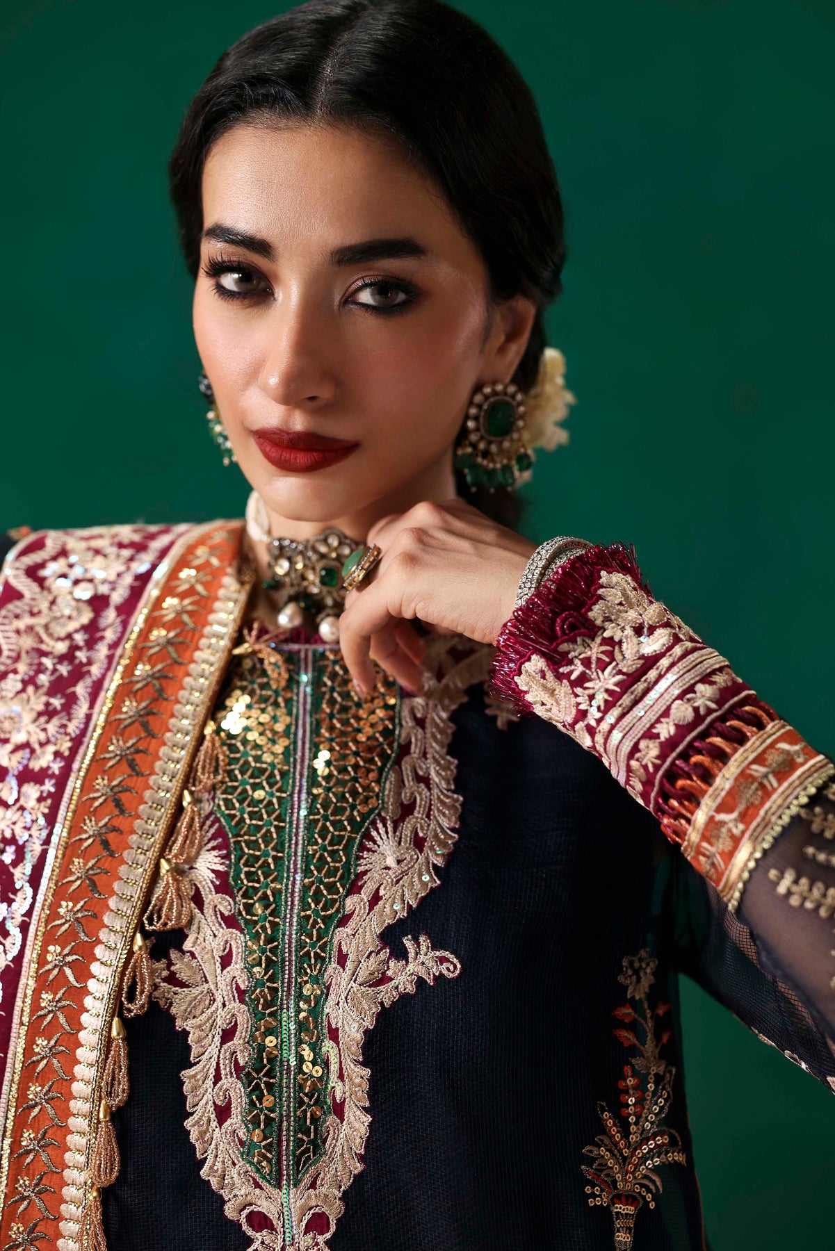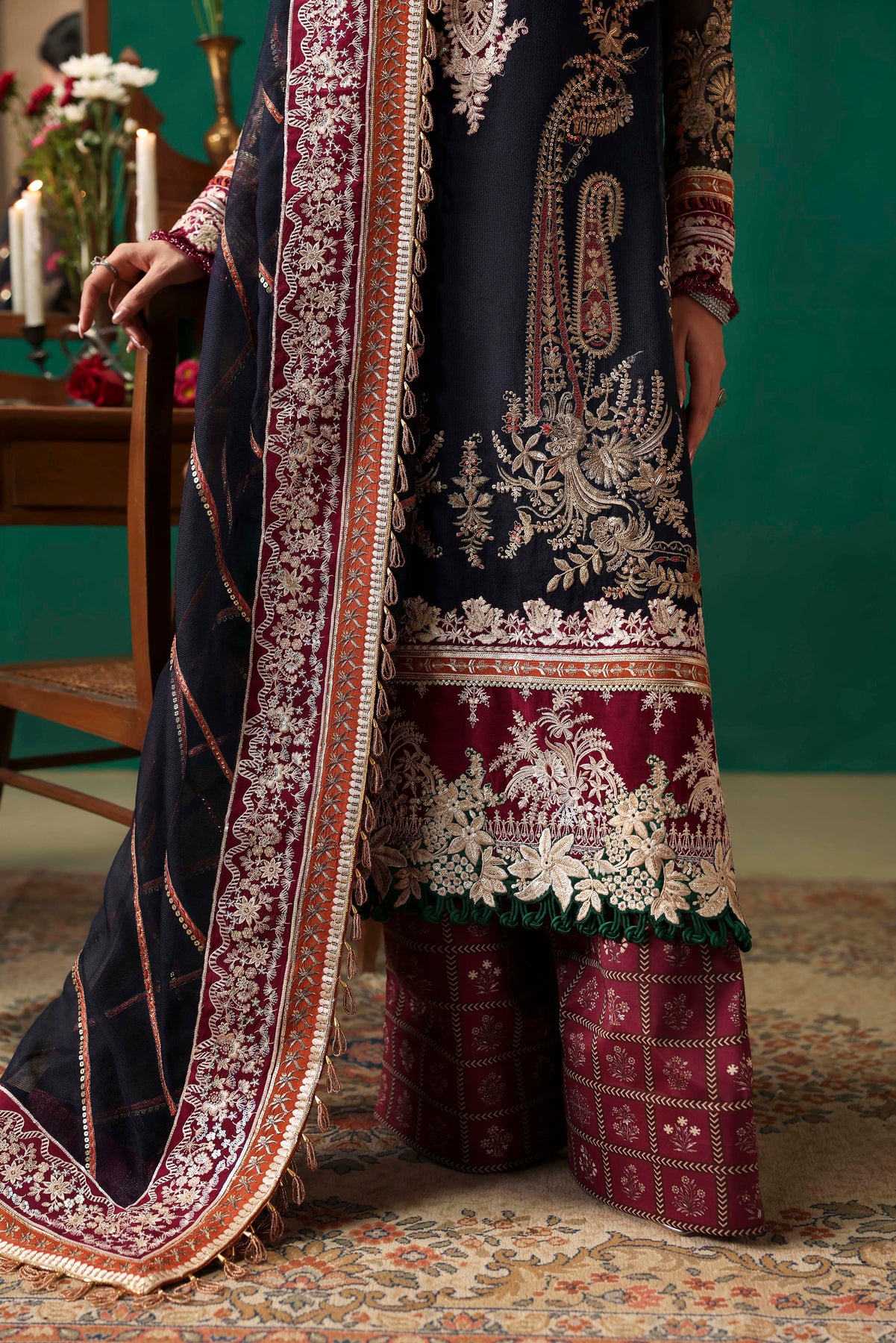 EMBROIDERED FRONT ON DYED NAVY BLUE NET FABRIC 26" 01 2. EMBROIDERED FRONT BORDER-1 ON DYED SILK 01 3. EMBROIDERED FRONT BORDER-2 ON DYED SILK 01 4. EMBROIDERED NECKLINE-1 ON DYED SILK 01 5. EMBROIDERED NECKLINE-2 ON DYED SILK 01 6. EMBROIDERED PATTI ON DYED SILK 5-M 01 7. EMBROIDERED FRONT SIDE KALI & BACK ON DYED NET NAVY BLUE FABRIC 52"01 8. EMBROIDERED SLEEVES ON DYED NAVY BLUE NET FABRIC 26" 01 9. EMBROIDERED SLEEVES PATTI ON DYED SILK 1-M 01 10. EMBROIDERED SLEEVES BORDER ON DYED SILK 1-M 01 11. EMBROIDERED DUPATTA ON DYED NAVY BLUE NET FABRIC 2.5-M 01 12. EMBROIDERED DUPATTA PATTI ON DYED SILK 8-M 01 13. EMBROIDERED DUPATTA BORDER ON DYED SILK 8-M 01 14. DYED (NAVY BLUE) INNER ON SILK FABRIC 2-M 01 15. PRINTED TROUSER ON CREPE SILK FABRIC 2.75-M 01