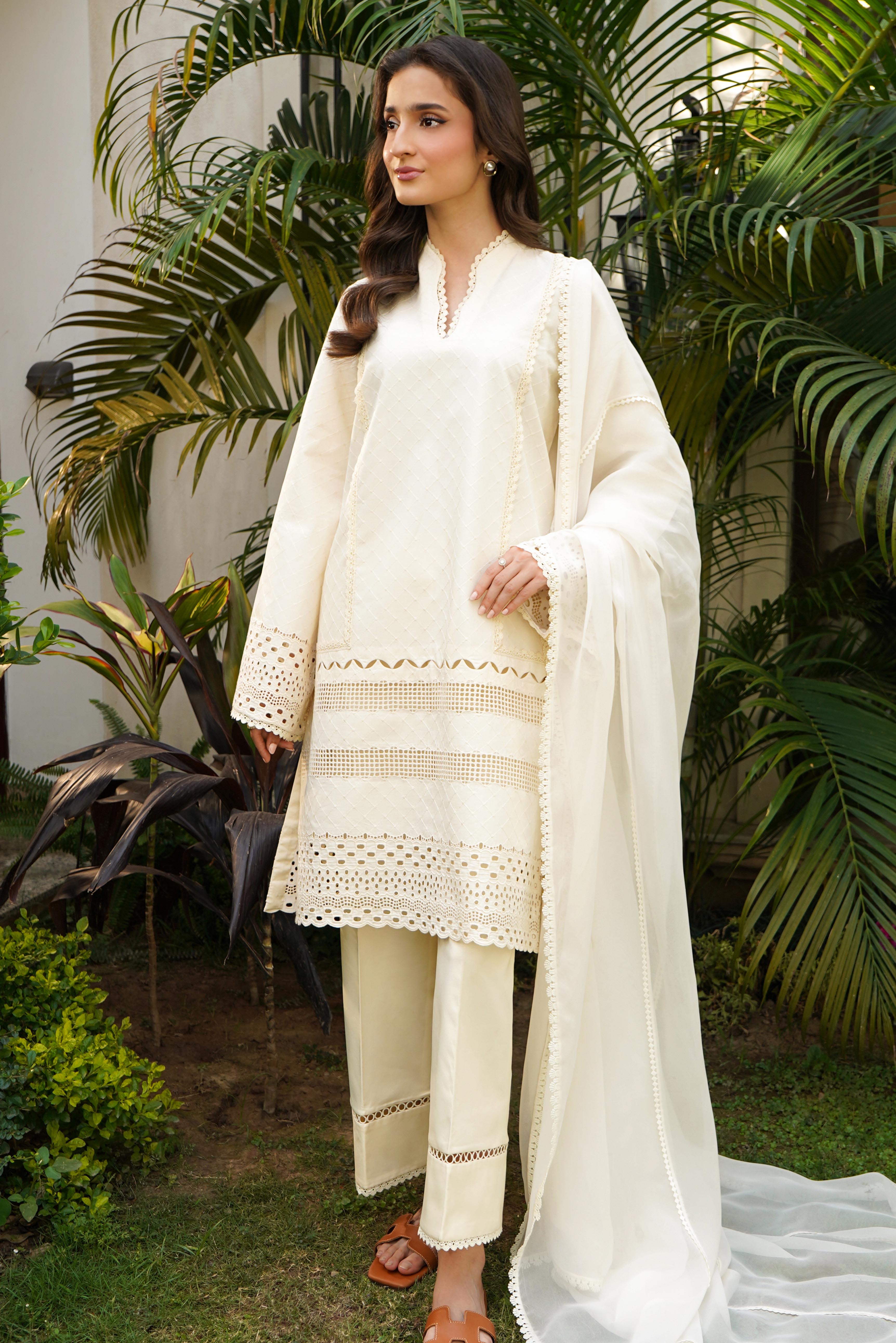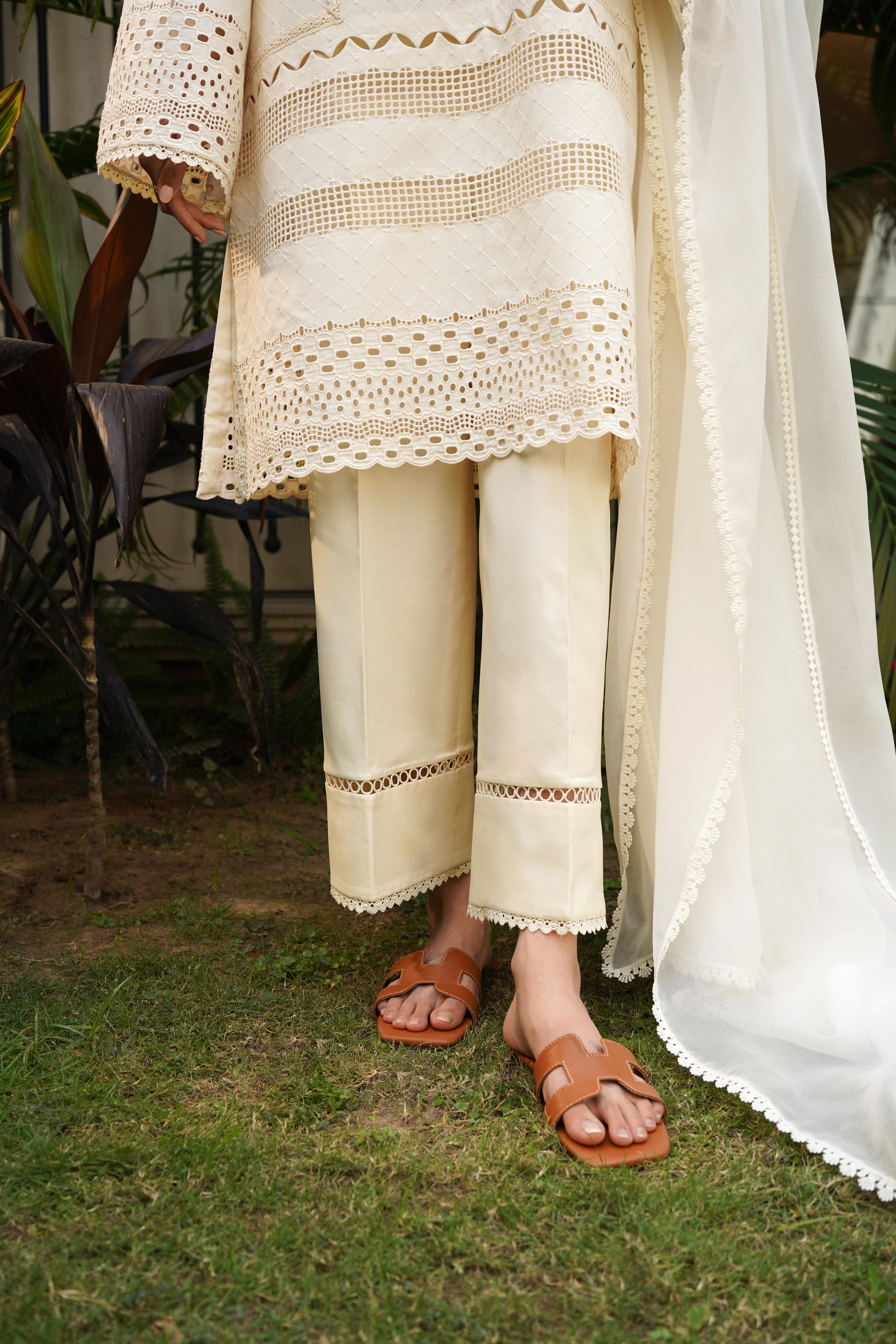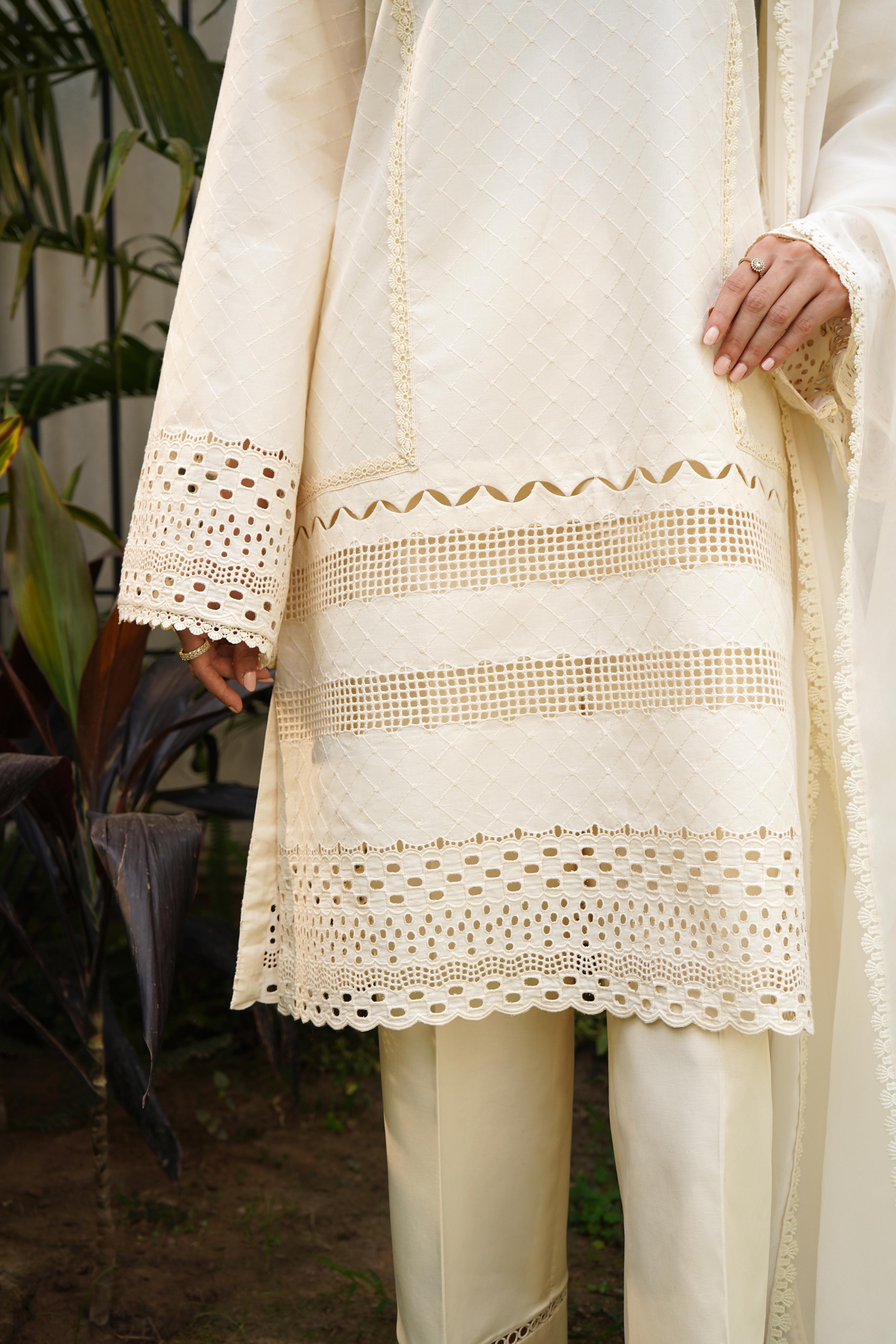 This eleganst 2-piece attire (Shirt & Pant) in a soft ivory shade features self embroidery with intricate boring and cutwork on the daman and sleeves. Embellished with a mix of delicate laces, the look is completed with straight cotton pants finished with lace detailing for a refined touch.