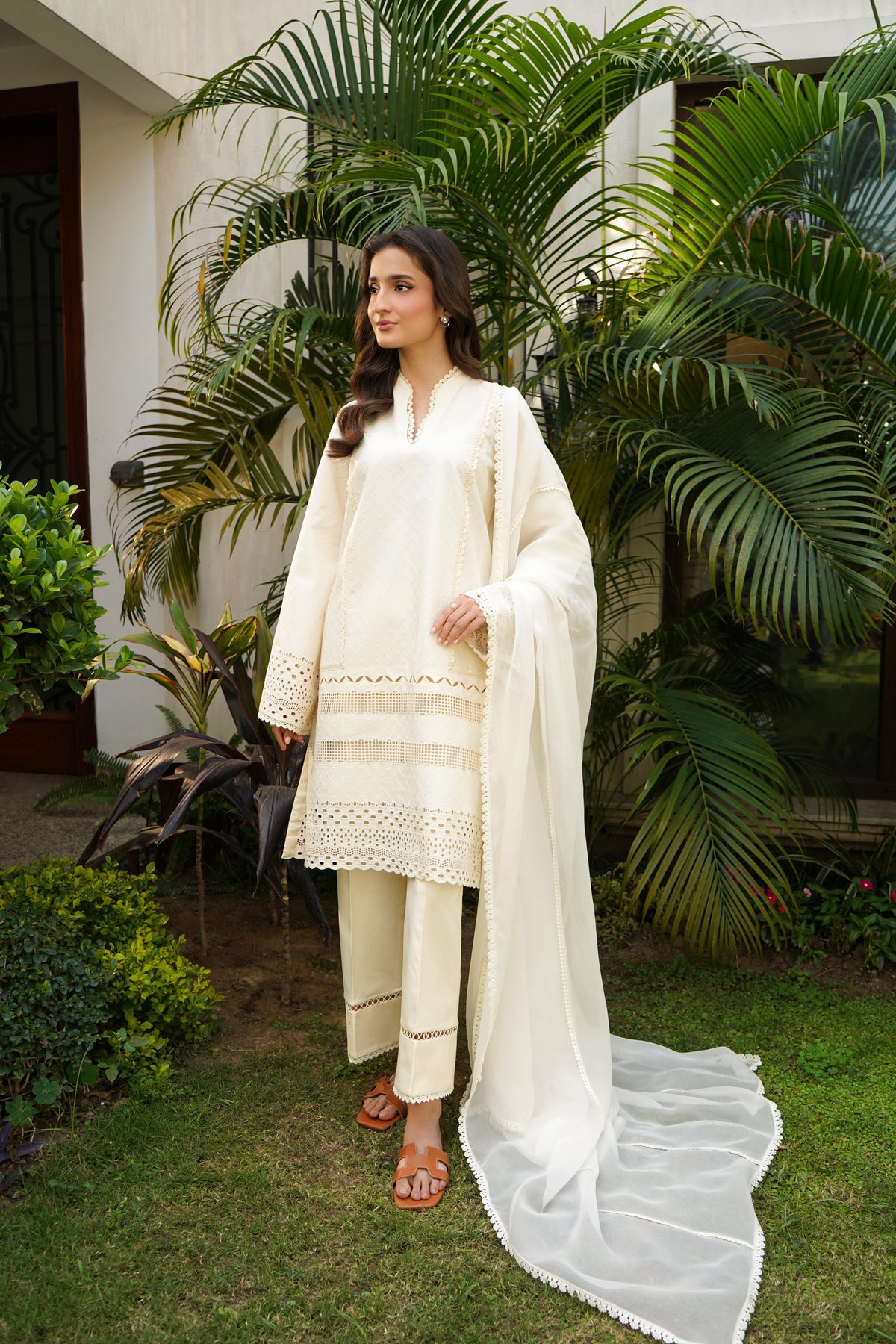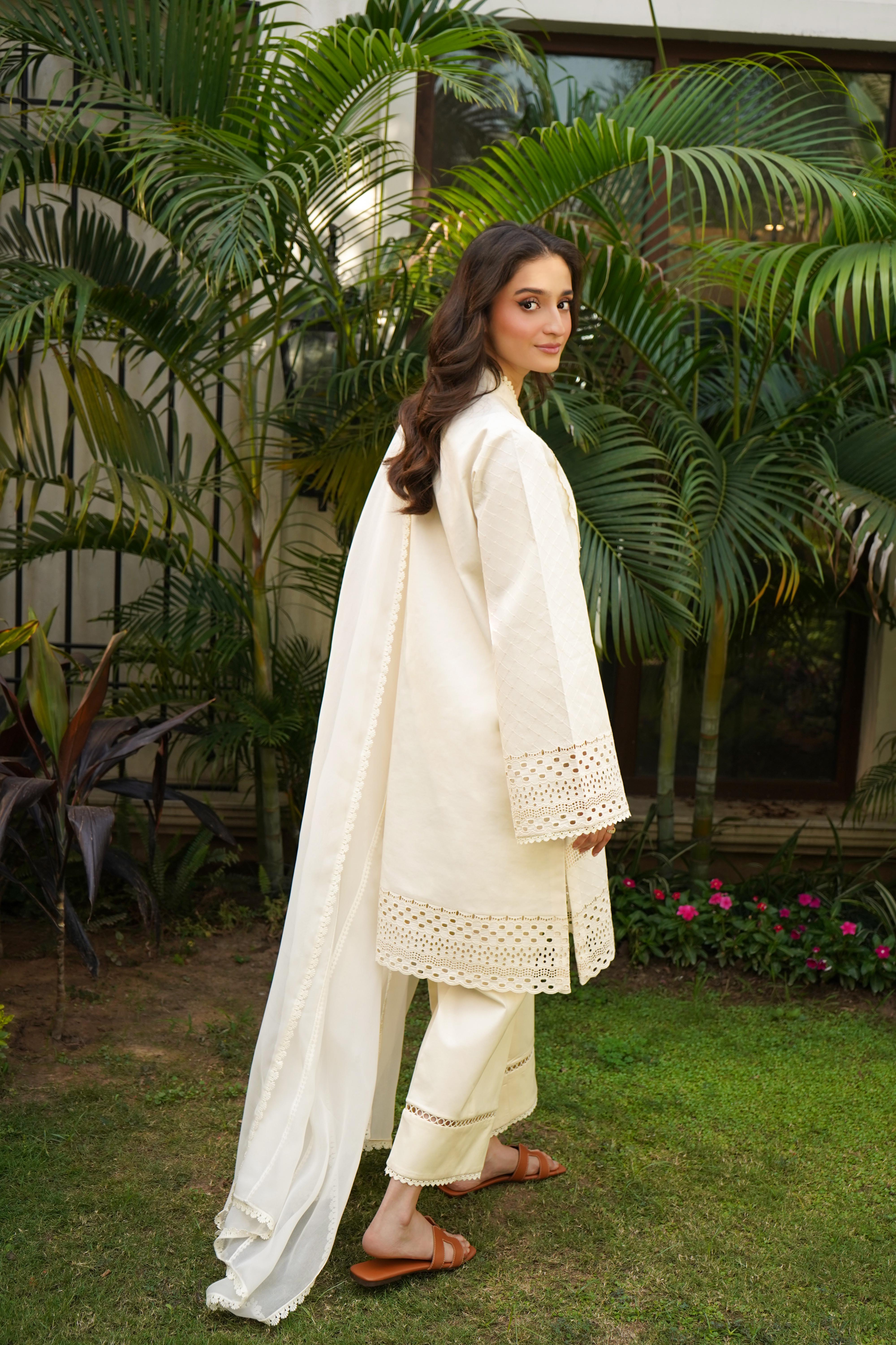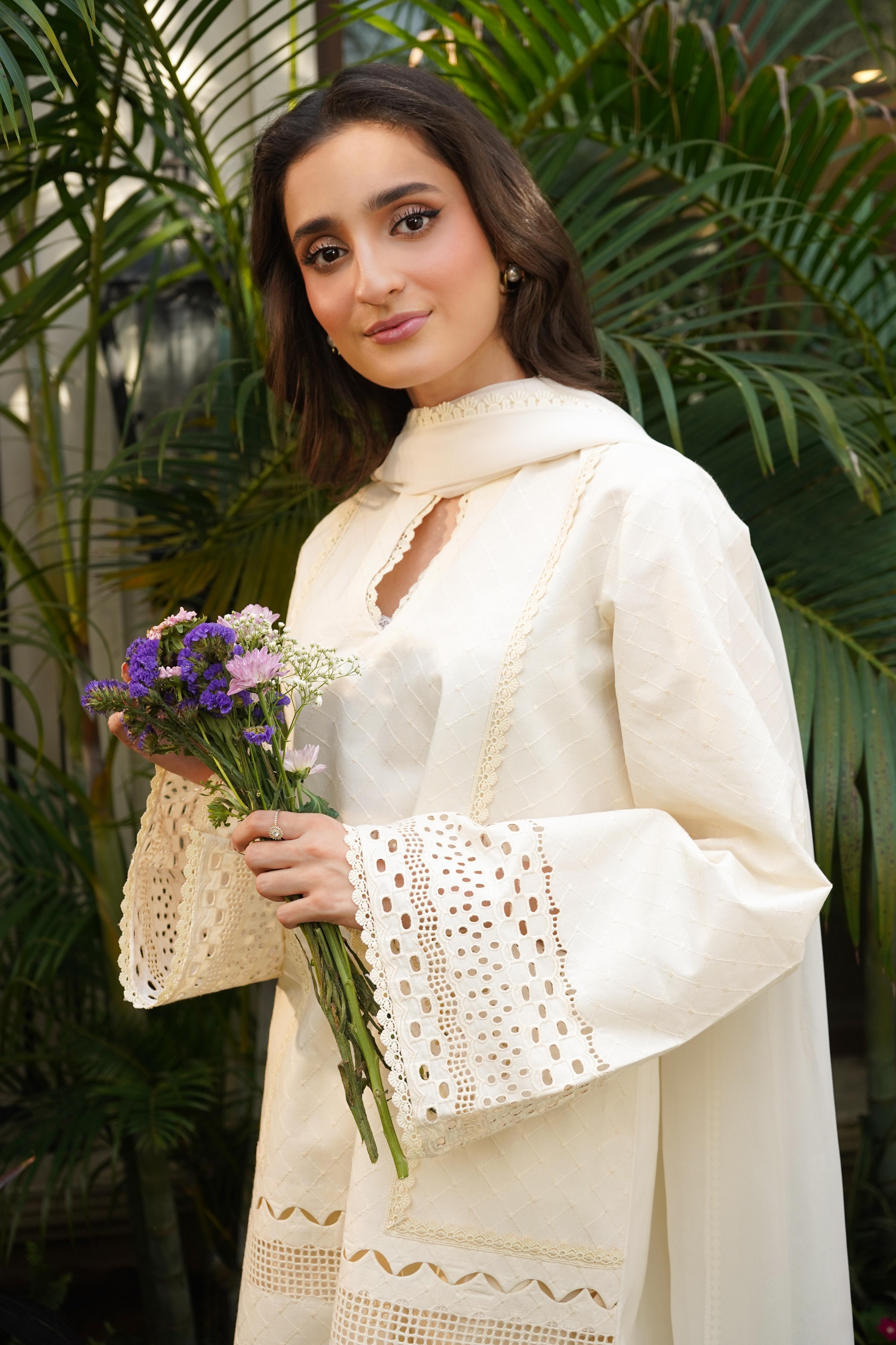 This eleganst 2-piece attire (Shirt & Pant) in a soft ivory shade features self embroidery with intricate boring and cutwork on the daman and sleeves. Embellished with a mix of delicate laces, the look is completed with straight cotton pants finished with lace detailing for a refined touch.