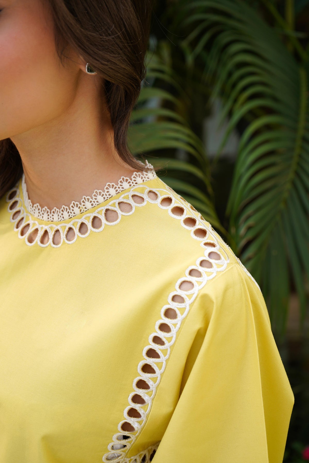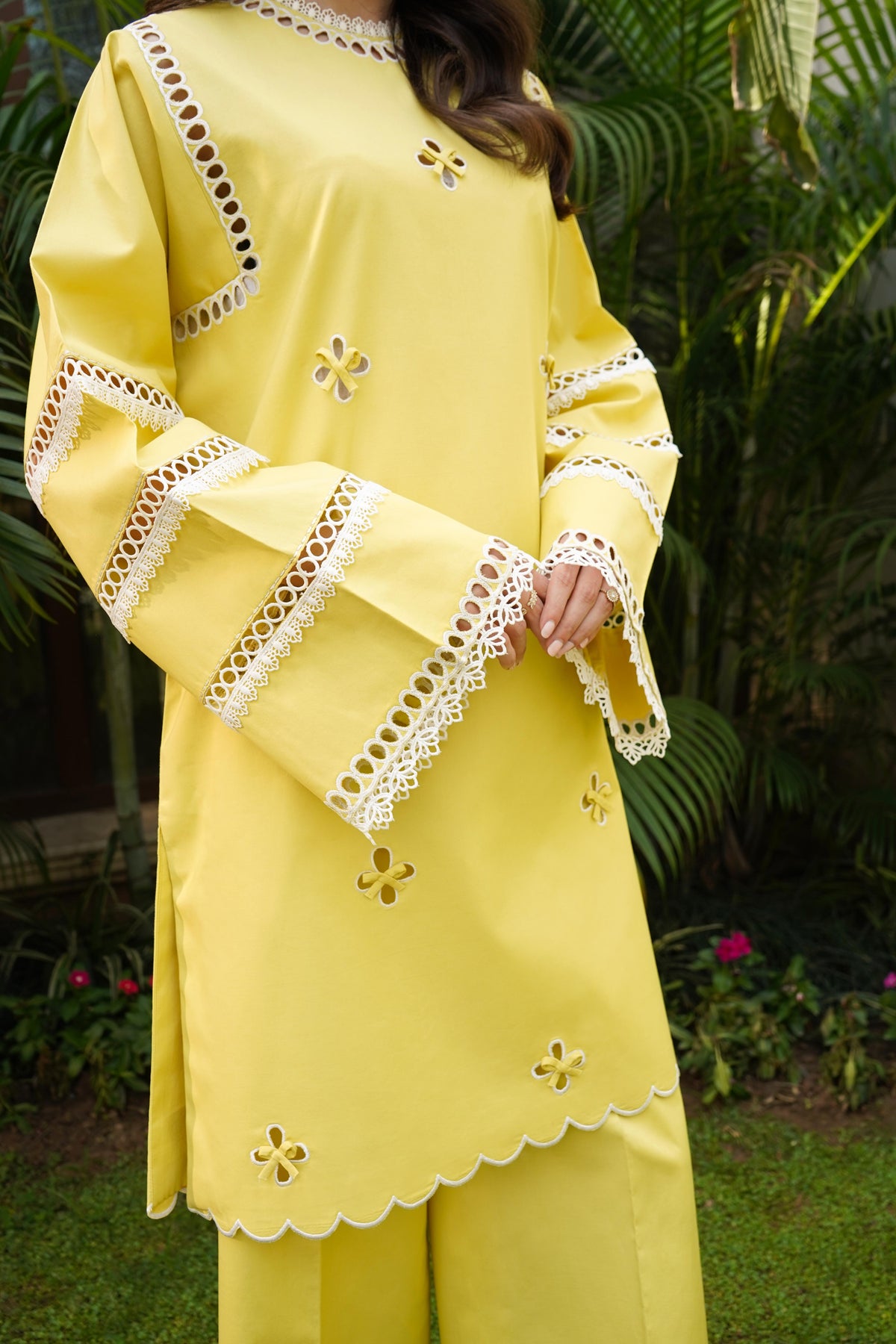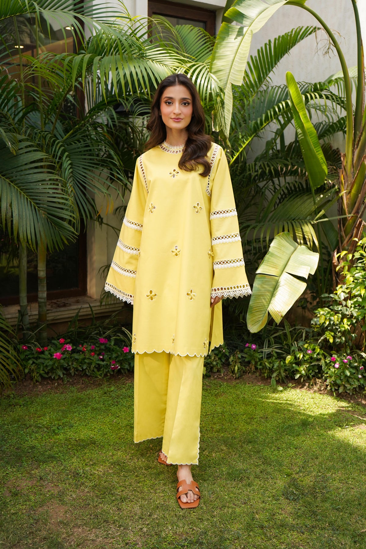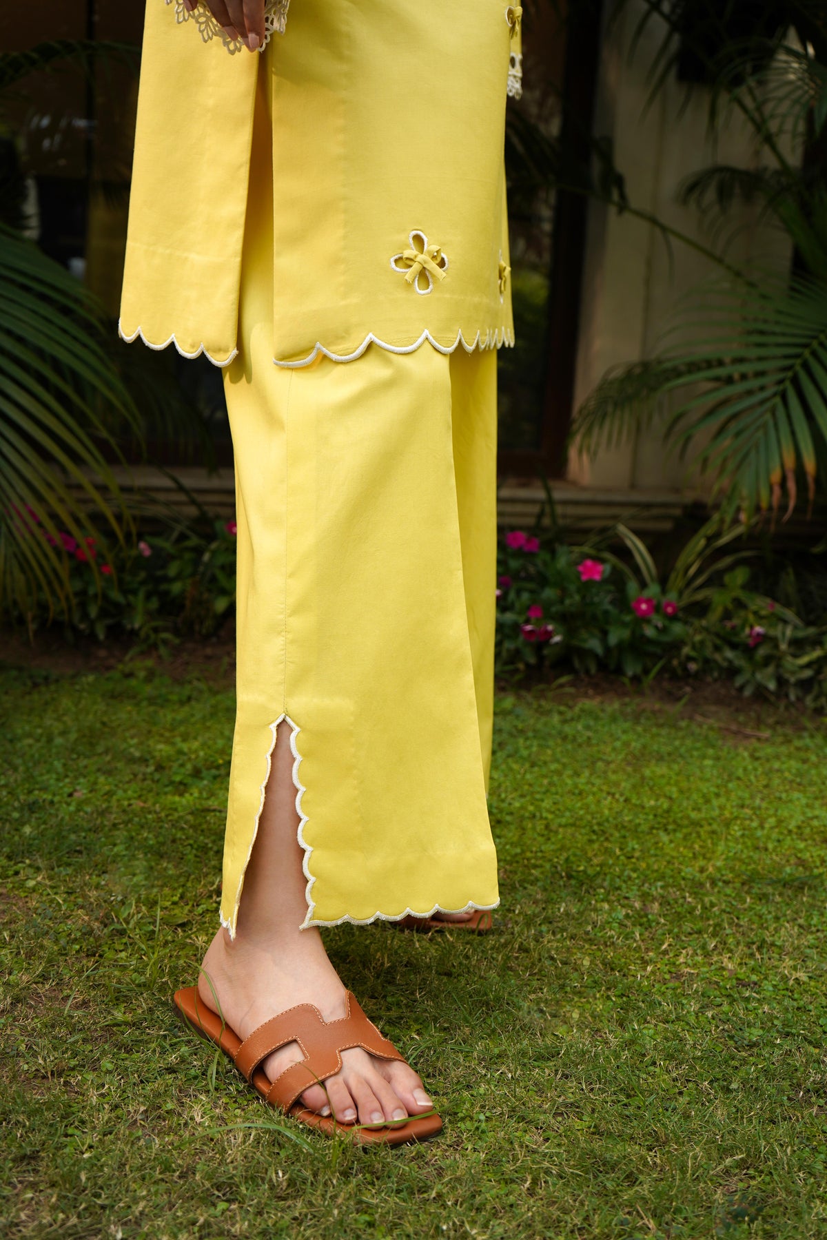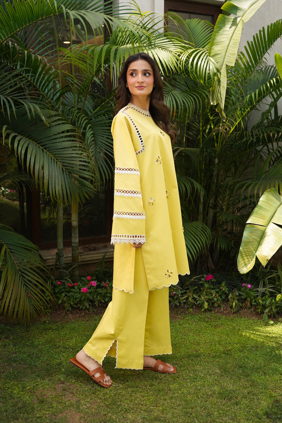This 2-piece attire (Shirt and Pant) in a refreshing lemon and white combination is tailored in premium Pima cotton. Featuring cutwork embroidery on the neckline, armhole, and front, the short crew-neck shirt has square armholes and bell sleeves adorned with three types of laces, finished with an embroidered cutwork border. The straight pants feature elegant side slits detailed with white resham cutwork.