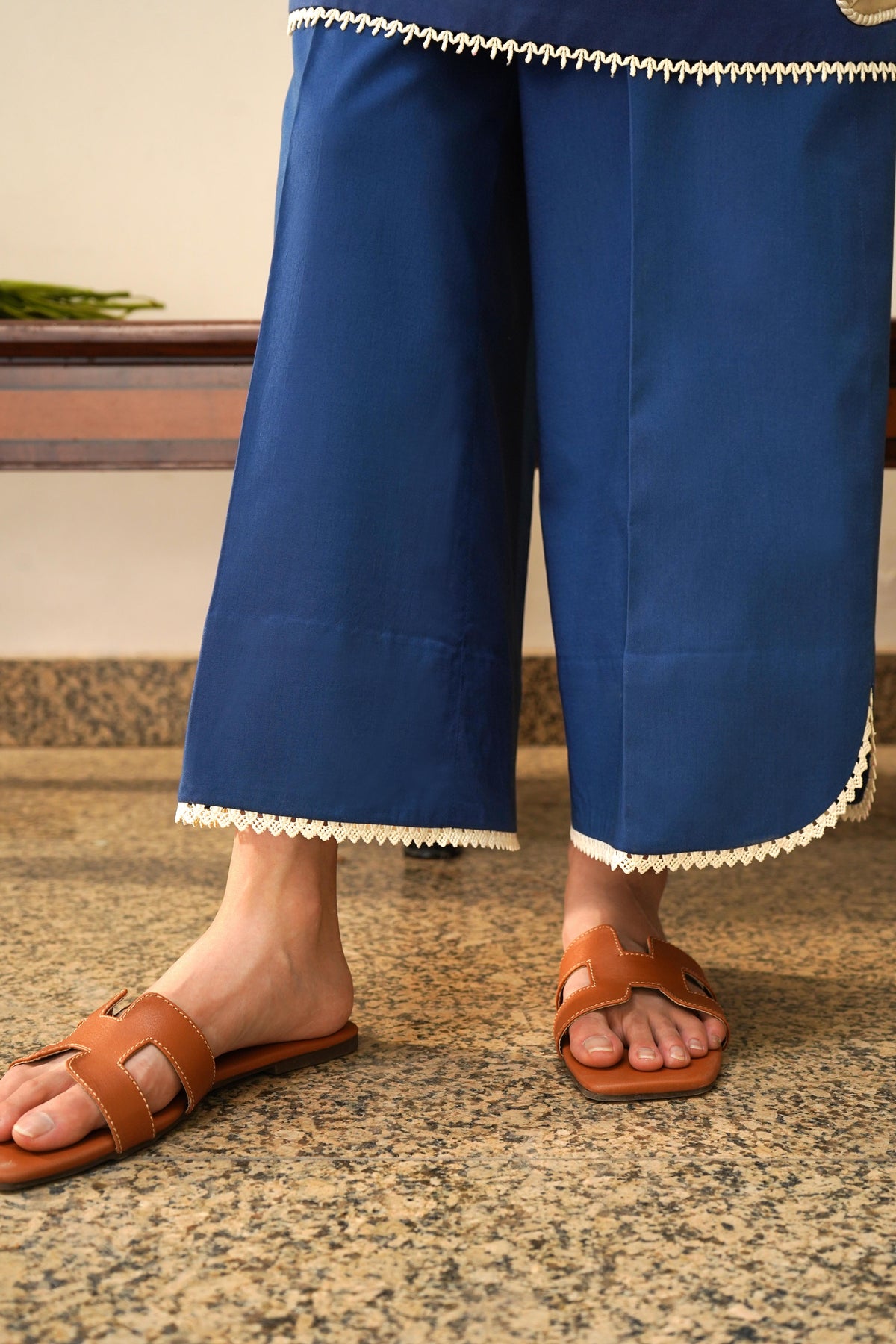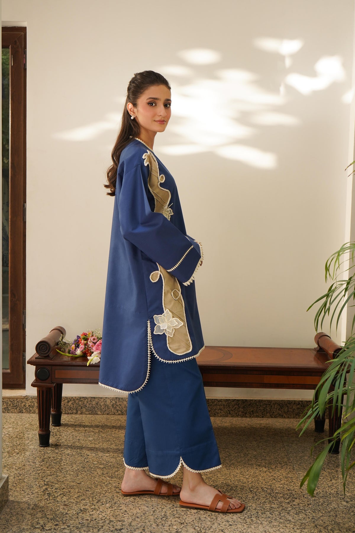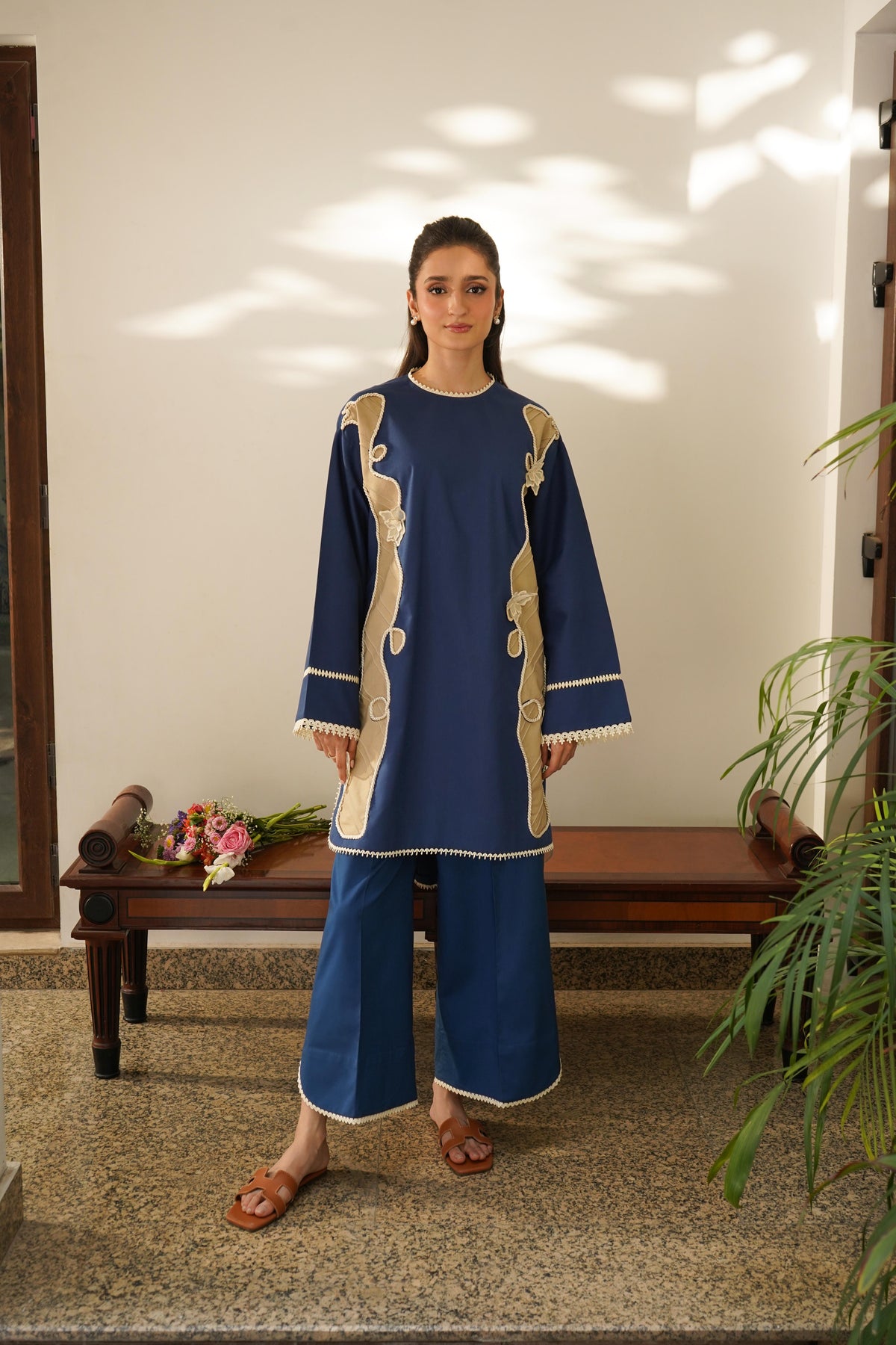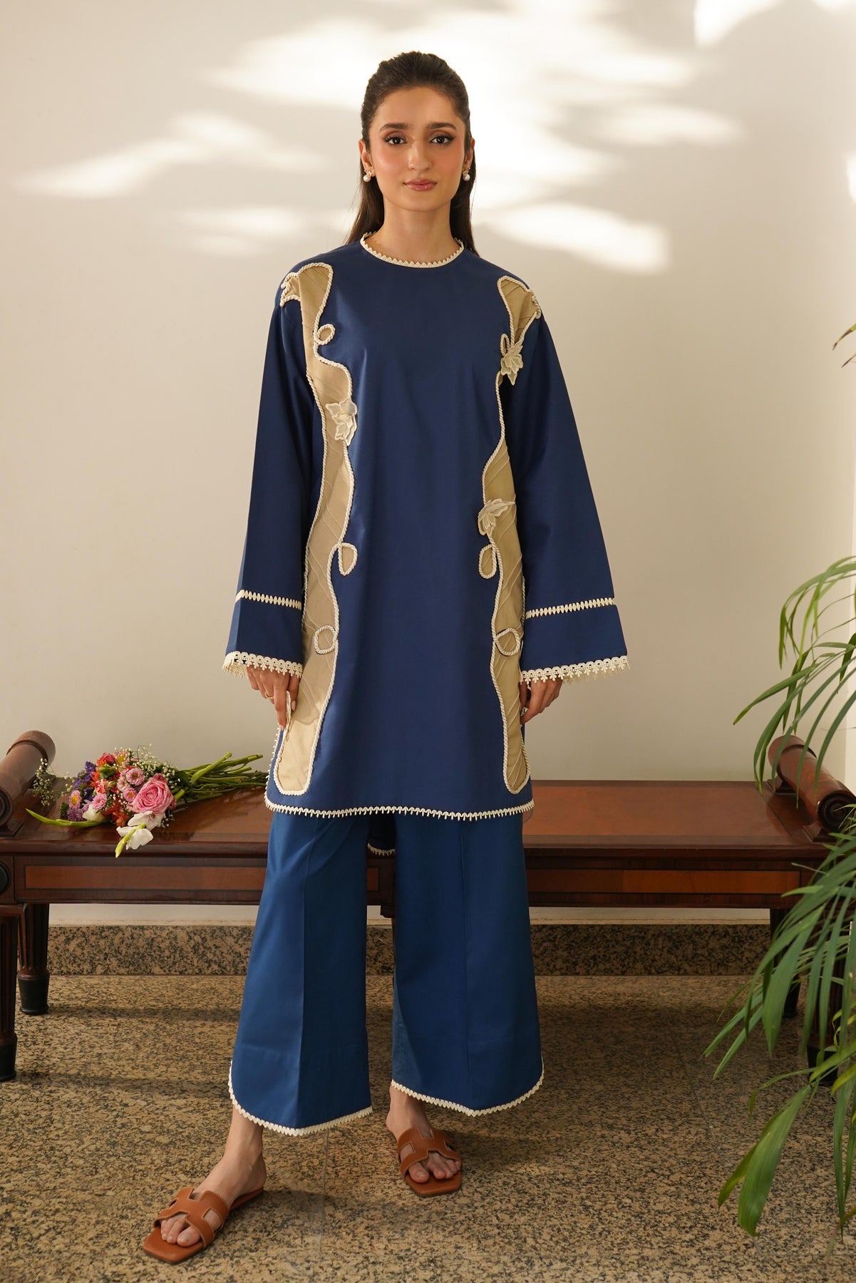 From our Summer Pret Collection This elegant 2-piece attire (Shirt & Pant) Crafted in rich navy blue premium cotton, this elegant 2-piece suit features a tasteful fusion of timeless grace and modern detail. The shirt is beautifully accented with pretty handmade 3D flowers, delicately arranged over a beige pintucked panel, adding dimension and charm. The panel is further outlined with fine hand-crafted dori work.